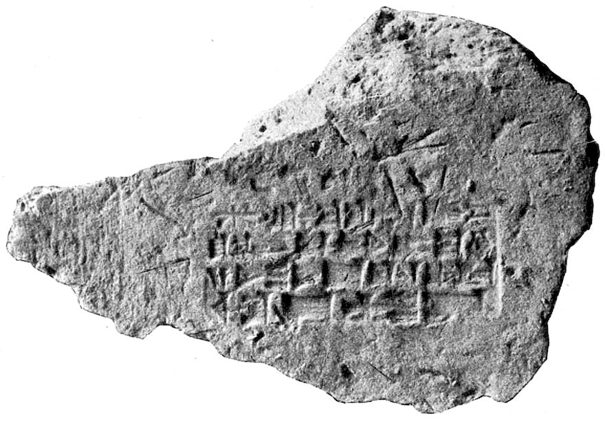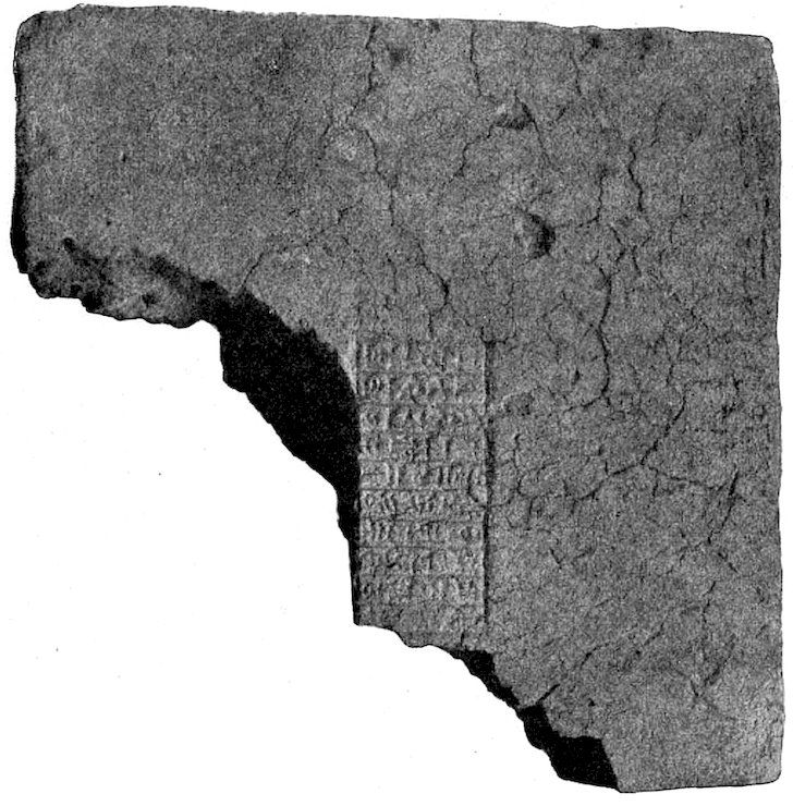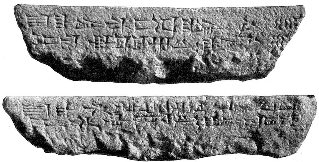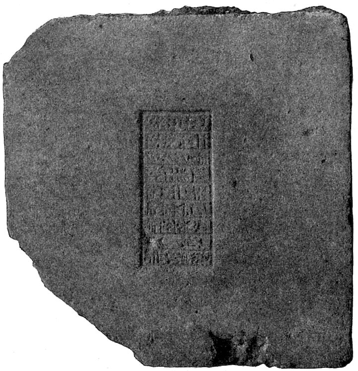 First in the tablet we have the measure of the outer court, called the “Grand Court,” which is given at 11. 33. 20 in length (that is about 1156 feet) and 9 in breadth (that is, 900 feet). There is a calculation as to the area of this court, which I pass over, and come to the next court called the “Court of Ishtar and Zamama.” This space is reckoned as 10. 33. 20 in length (1056 feet) and 430 (450 feet) in breadth. There is again here a calculation of the area which I omit.