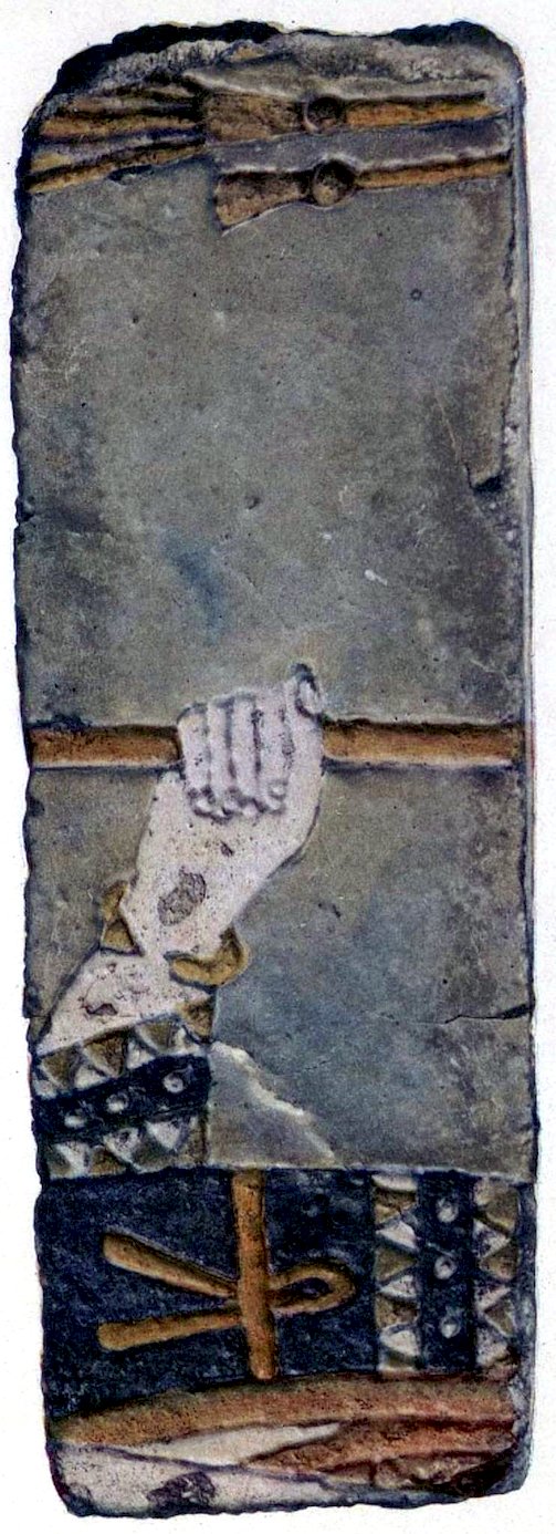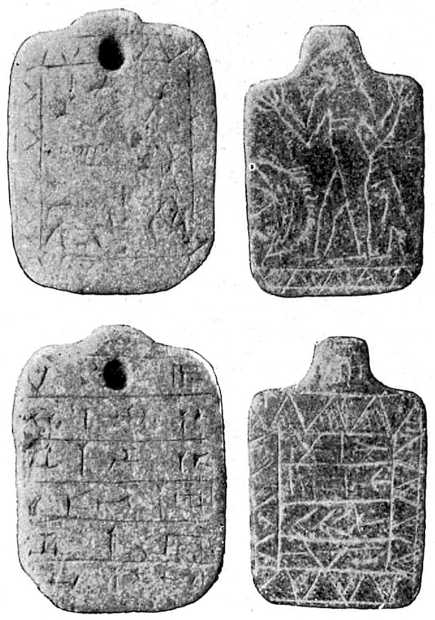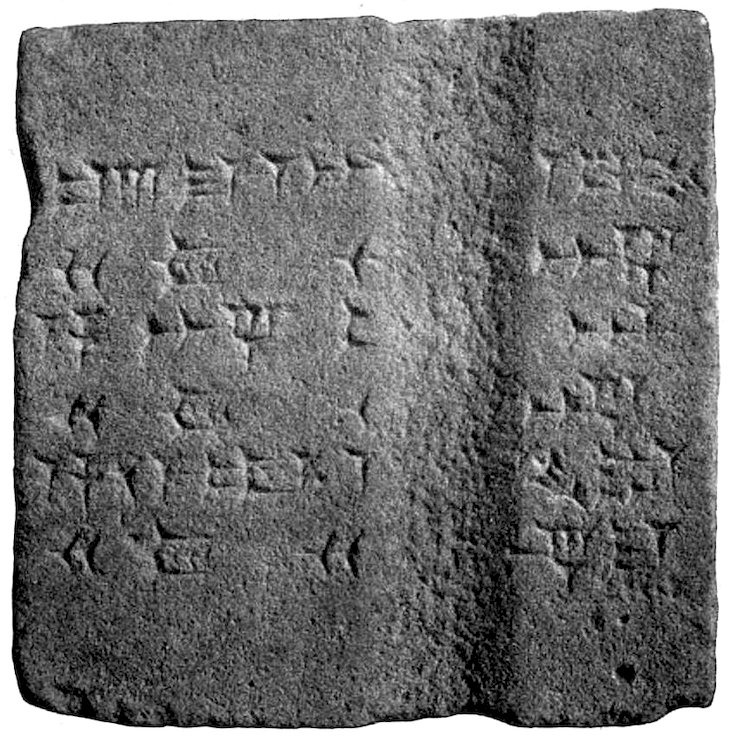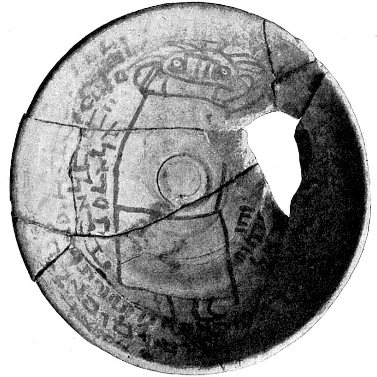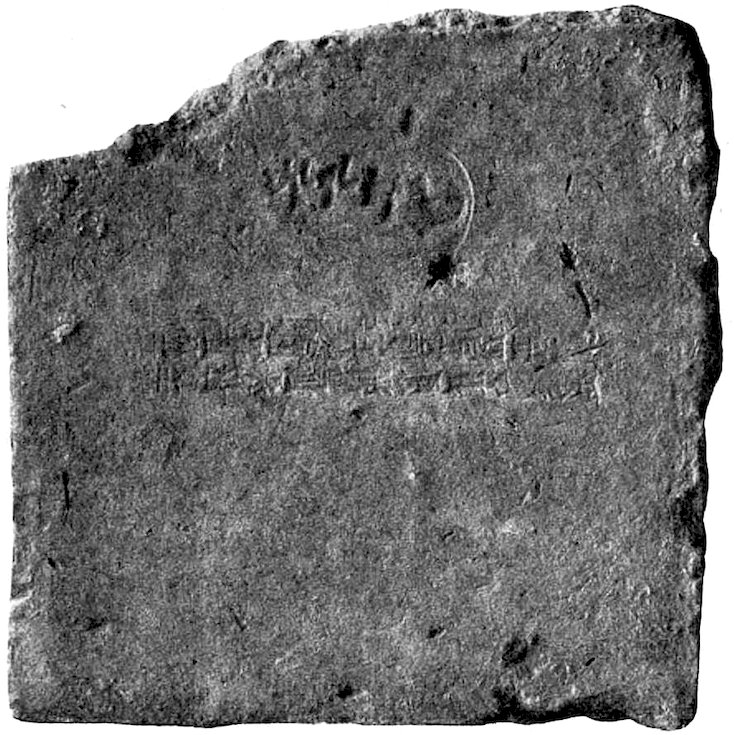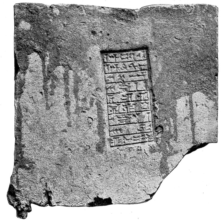 Ungnad translates the inscription: 1. (iṣu) ṣupur iṣṣuri(?) li (?)-in-ti-ka (?) 2. paan ... -šù(?)-du abulli-šu 3. l[i]-ni’-irat-su 4. mit-gar-śu u(?) ki-bi-su(?) li-in-na(?)[...]. “May the claw of the bird (?) tear to pieces (?) the countenance of him, who ... his gate, and may it hold back his breast; him who is favourable to him and (?) ... may he....”