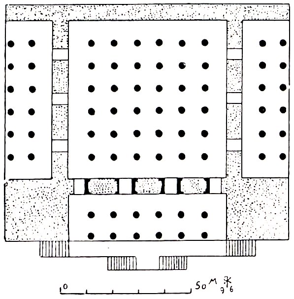 Round the court were 6 gates admitting to the temples. These were: 1, the grand gate; 2, the gate of the rising sun (east); 3, the great gate; 4, the gate of the Colossi; 5, the gate of the Canal; and 6, the gate of the tower-view.