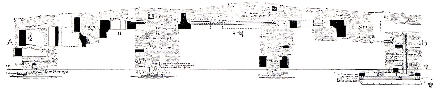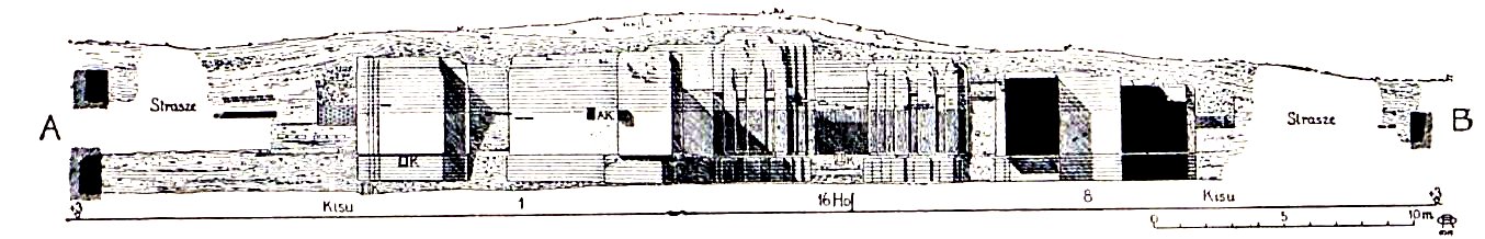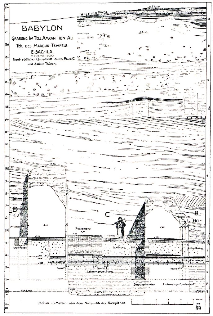 1908. The main work lay in Merkes. It led inter alia to the uncovering of the earliest strata that have yet been reached and that belong to the period of the earliest Babylonian kings. In February, as a lengthy secondary piece of work, the opening up of Sachn was begun at the Tower of Babylon and lasted till June 1911. Also in July a cut was made through the quarter to the west of Sachn, which brought to light the Arachtu wall and the Nabonidus wall at this place.