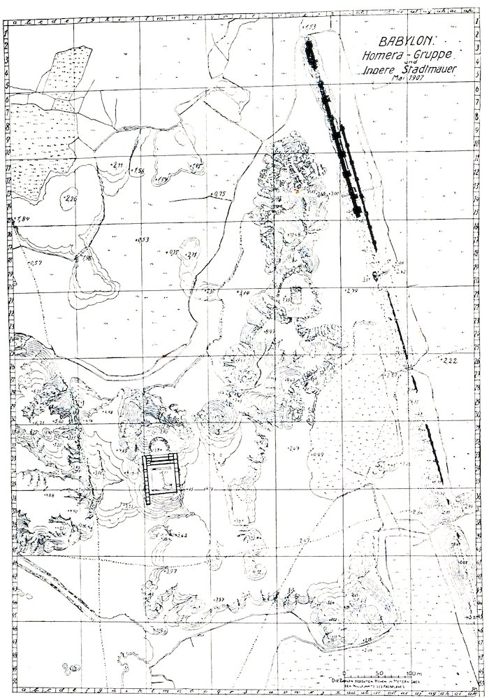 1907. From the Persian Building a long exploration trench was carried through the western quarter, December 1906–March 1907; the eastern ends of the two mud walls in front of the Ninmach Temple were excavated, June-October, and a small piece of the outer wall near Babil, June-July. In October the southern quay wall of the canal south of the Kasr was followed up farther and the excavations in Merkes were begun, which with varying degrees of activity have been carried on up to the present time, May 1912.