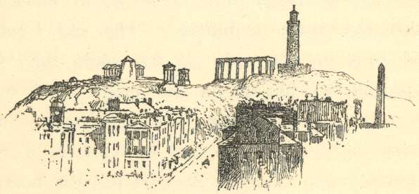 The east of new Edinburgh is guarded by a craggy hill, of no great elevation, which the town embraces. The old London road runs on one side of it; while the New Approach, leaving it on the other hand, completes the circuit. You mount by stairs in a cutting of the rock to find yourself in a field of monuments. Dugald Stewart has the honours of situation and architecture; Burns is memorialised lower down upon a spur; Lord Nelson, as befits a sailor, gives his name to the top-gallant of the Calton Hill. This latter erection has been differently and yet, in both cases, aptly compared to a telescope and a butter-churn; comparisons apart, it ranks among the vilest of men’s handiworks. But the chief feature is an unfinished range of columns, ‘the Modern Ruin’ as it has been called, an imposing object from far and near, and giving Edinburgh, even from the sea, that false air; of a Modern Athens which has earned for her so many slighting speeches. It was meant to be a National Monument; and its present state is a very suitable monument to certain national characteristics. The old Observatory—a quaint brown building on the edge of the steep—and the new Observatory—a classical edifice with a dome—occupy the central portion of the summit. All these are scattered on a green turf, browsed over by some sheep.