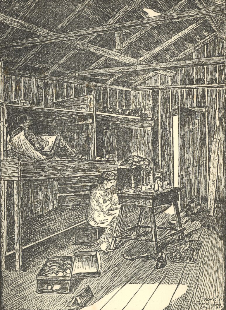 There was another neighbour of ours at Silverado, small but very active, a destructive fellow. This was a black, ugly fly—a bore, the Hansons called him—who lived by hundreds in the boarding of our house. He entered by a round hole, more neatly pierced than a man could do it with a gimlet, and he seems to have spent his life in cutting out the interior of the plank, but whether as a dwelling or a store-house, I could never find. When I used to lie in bed in the morning for a rest—we had no easy-chairs in Silverado—I would hear, hour after hour, the sharp cutting sound of his labours, and from time to time a dainty shower of sawdust would fall upon the blankets. There lives no more industrious creature than a bore.