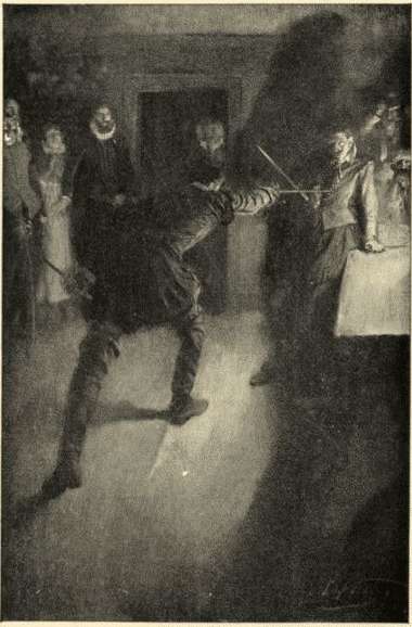 The group had been sitting before the wide fireplace. But as soon as the roast fowls were brought in, there was a movement to the long table in the middle of the room. The captain was gifted with active, striding legs and long, slashing arms. So he was first to be seated, and, as he leaned forward upon his elbows, he seemed to cover more than his share of the table. He had a broad, solid forehead, an assertive nose, a narrow but forward chin, gray eyes accustomed to flash with a devil-may-care defiance, a firm mouth inured to a curve of sardonic derision. His rebellious hair, down-turning moustaches, and pointed beard were of a dark brown hue. He was a man of good height; below the sword-belt, he was lank to the ground; above, he broadened out well for chest and shoulders. His voice was quick, vigorous, and not unpleasantly met[13]allic. He was under thirty, but rough experience had hardened his visage to an older look. His jerkin, shirt, hose, shoes, and ruff also betokened much and severe usage.