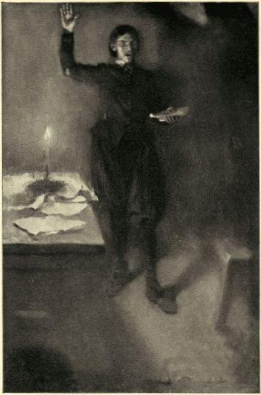The scholar had indeed struck his nose with the fowl, when he had meant to bring it again between his teeth. He was conscious of the increased effect of the wine in other ways, too, and chiefly in a pleasanter perception of everything, a sense of agreeable comicality in all his surroundings, a warmed regard for all objects within view or thought. This enhanced the enjoyment of his meal. The moonlight, though frequently dimmed by rushing scraps of cloud, made visible the streets near whose junc[20]tion he sat, so that the house fronts stood strangely forth in weird shine and shadow. The scholar, shivering upon the steps, was the only living creature in the scene. Yet there seemed to be a queer half-life come into inanimate things. The wind could be heard moaning sometimes in unseen passages. The hanging signs creaked as if they now and then conversed one with another in brief, monosyllabic language.