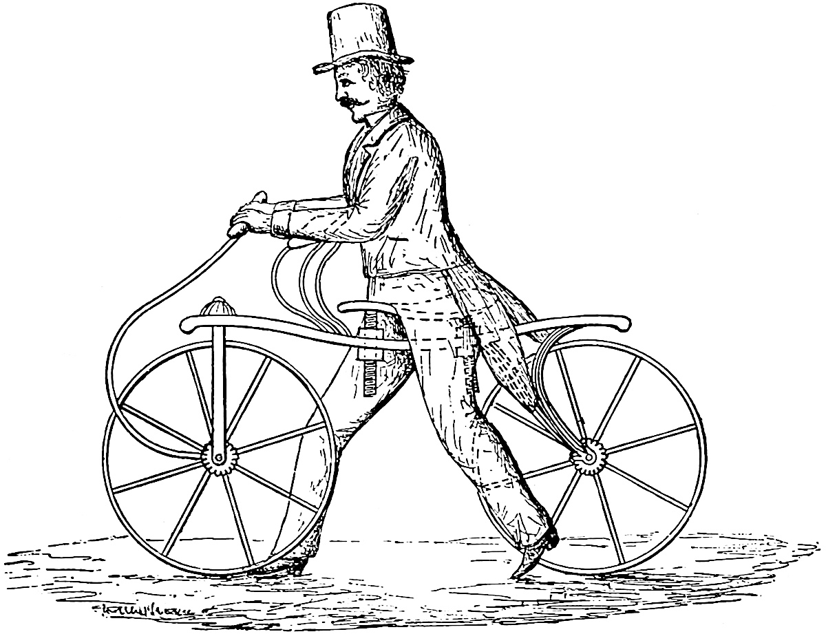 “The object of this invention is to provide a machine which is safe, strong, and serviceable, and more easily steered than the machines now in use, and also to construct the machine in such manner that the same can be folded when not required for use, so as to require little storage-room and facilitate its transportation.