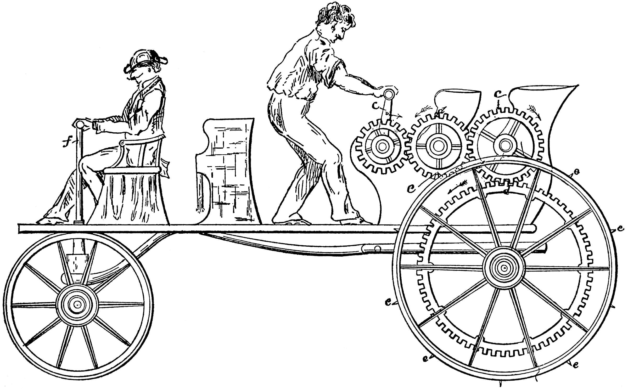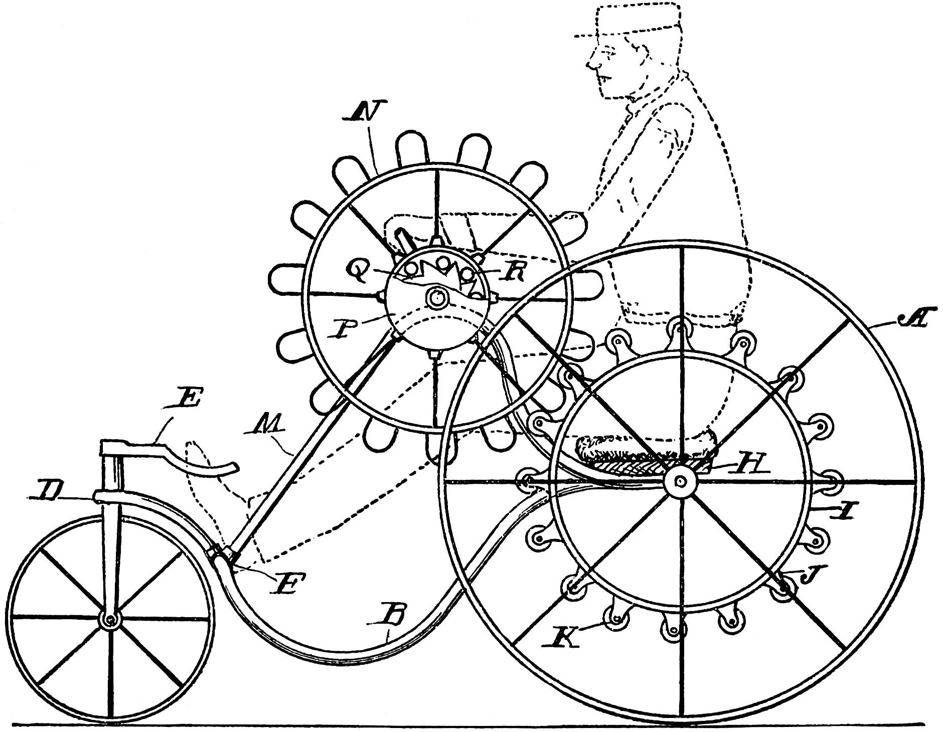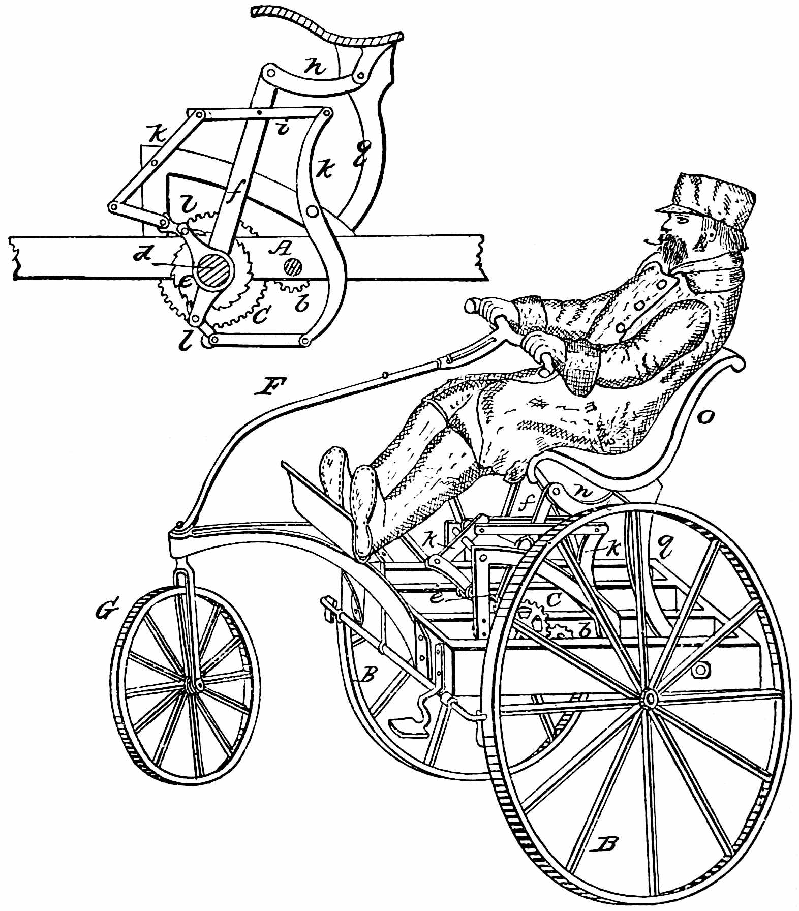 “The operation of this device is very simple. The operator seated within the machine operates the crank O of the shaft L, and the spur-wheels N, engaging with the spur-wheels I, move the vehicle forward. The steering-wheel C is operated by the feet in connection with the lever E.”