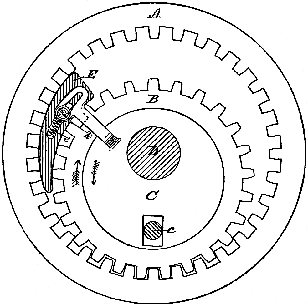 “To allow of entering the machine, a portion, c′, of one felly is made separate, and the hub a made with a hinged segment, a2, to which the spokes from the felly-segment c′ connect, so that the latter can be swung out.”