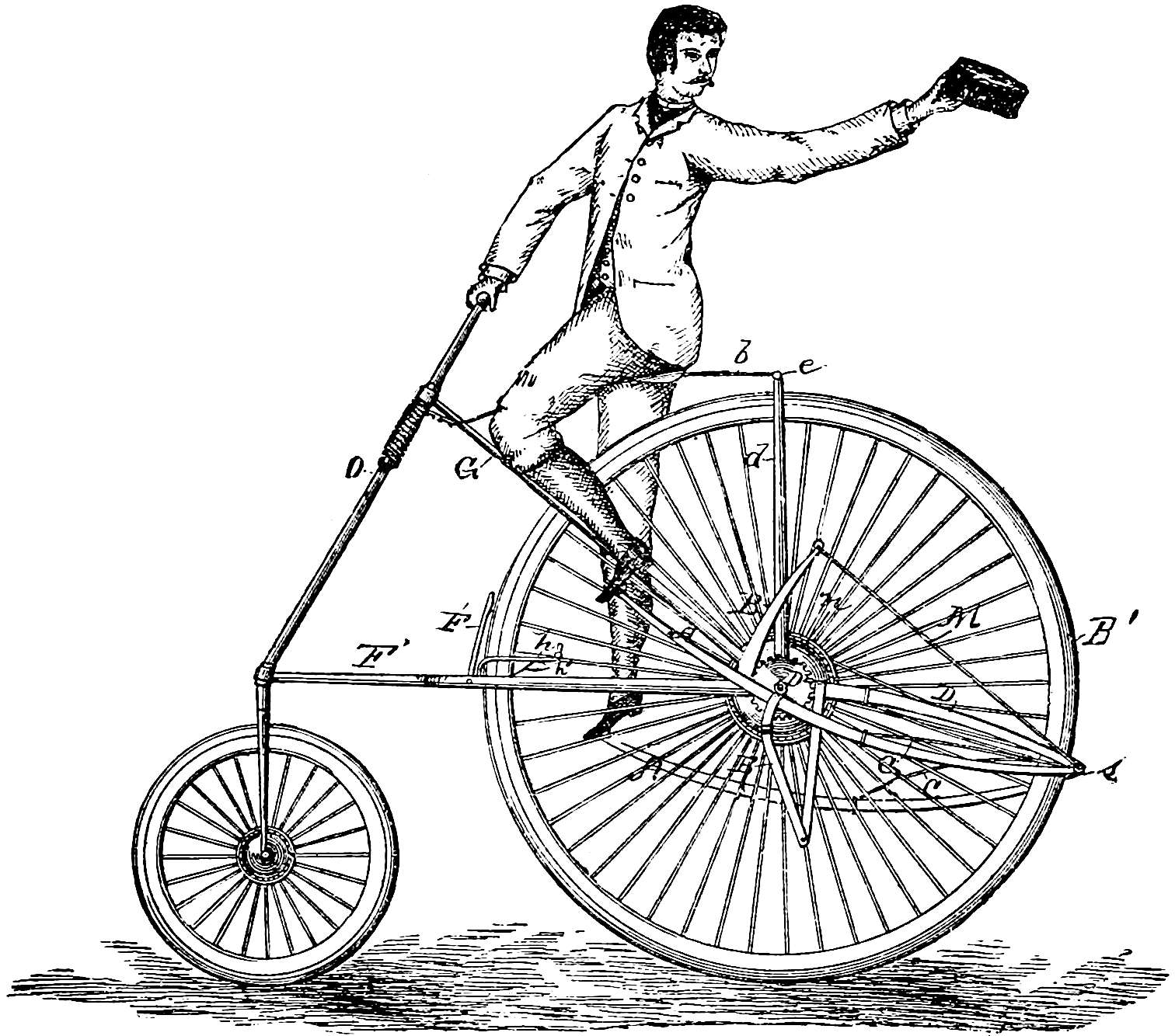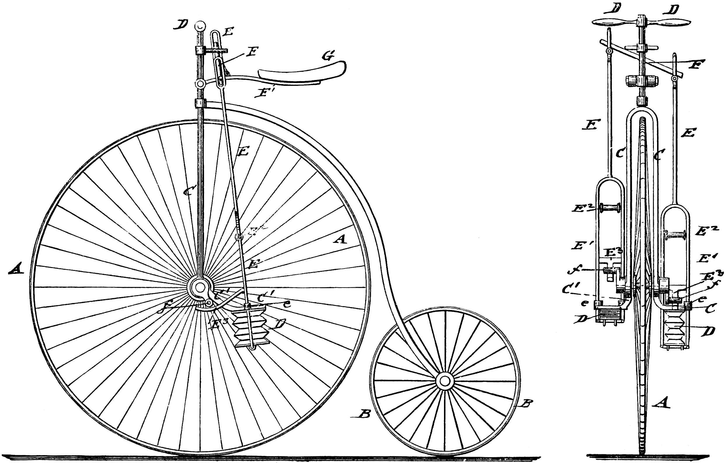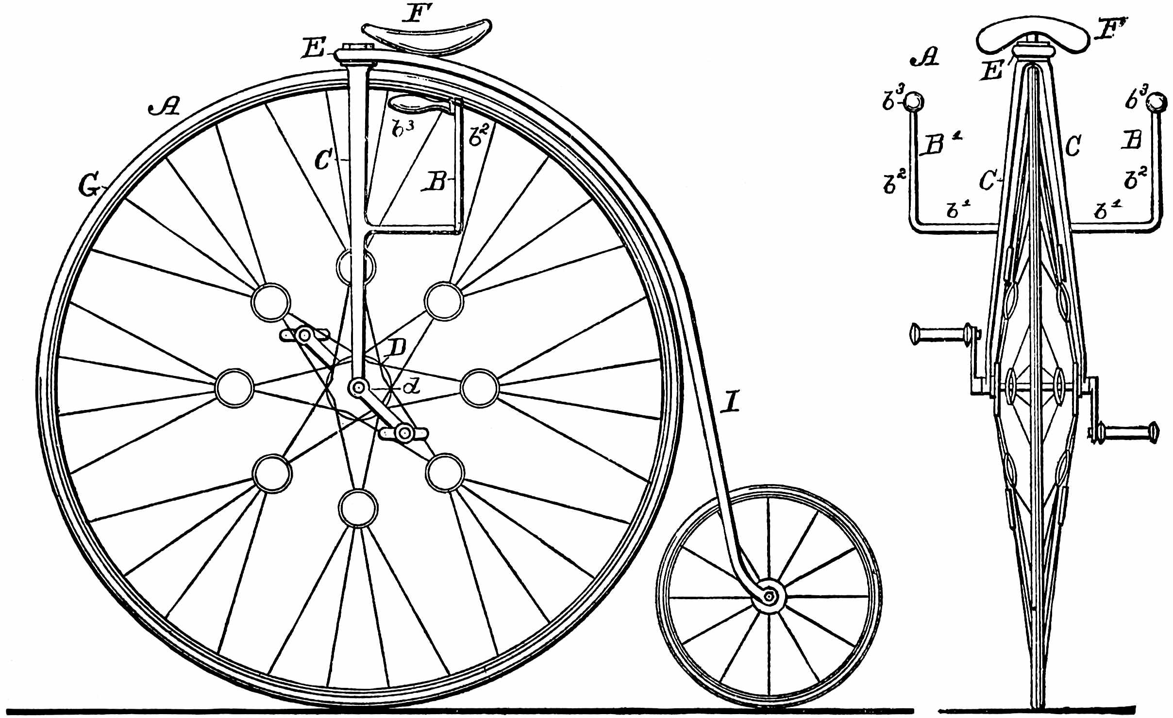 “The advantage of this form of handle-bars is that it enables the rider to mount from in rear of the large wheel in the usual manner, and to dismount either in the rear or in the front of the large wheel. It also permits of an upward pull upon the handle in propelling the wheel.