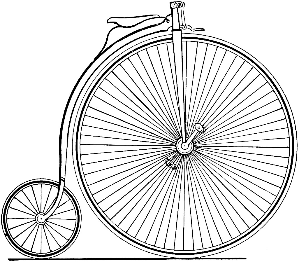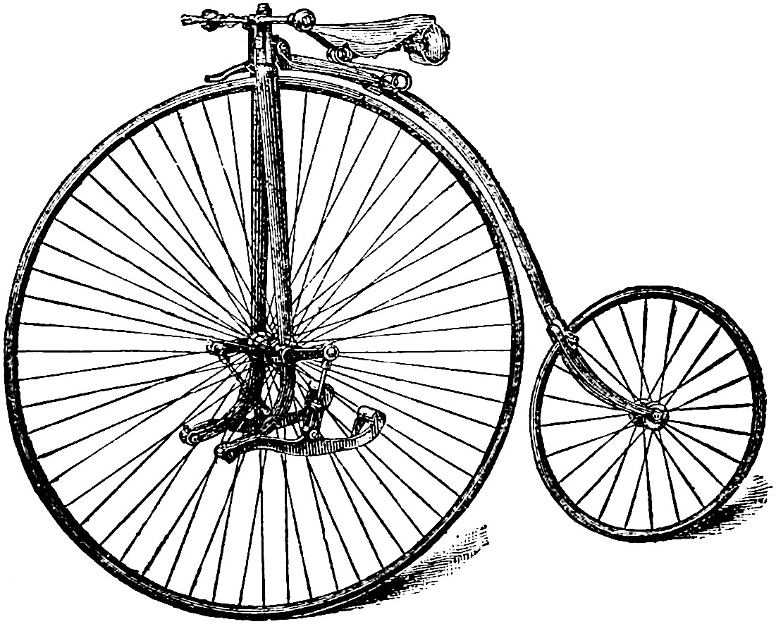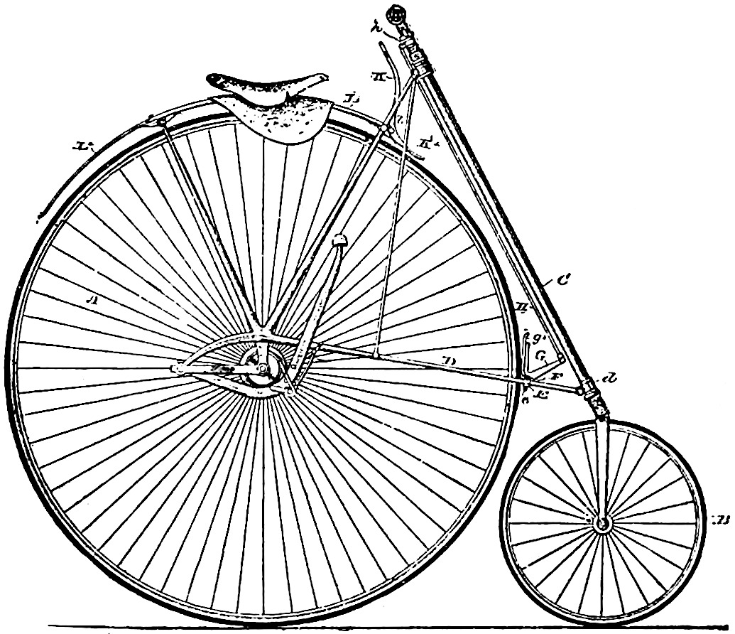 “The advantage of this form of handle-bars is that it enables the rider to mount from in rear of the large wheel in the usual manner, and to dismount either in the rear or in the front of the large wheel. It also permits of an upward pull upon the handle in propelling the wheel.
