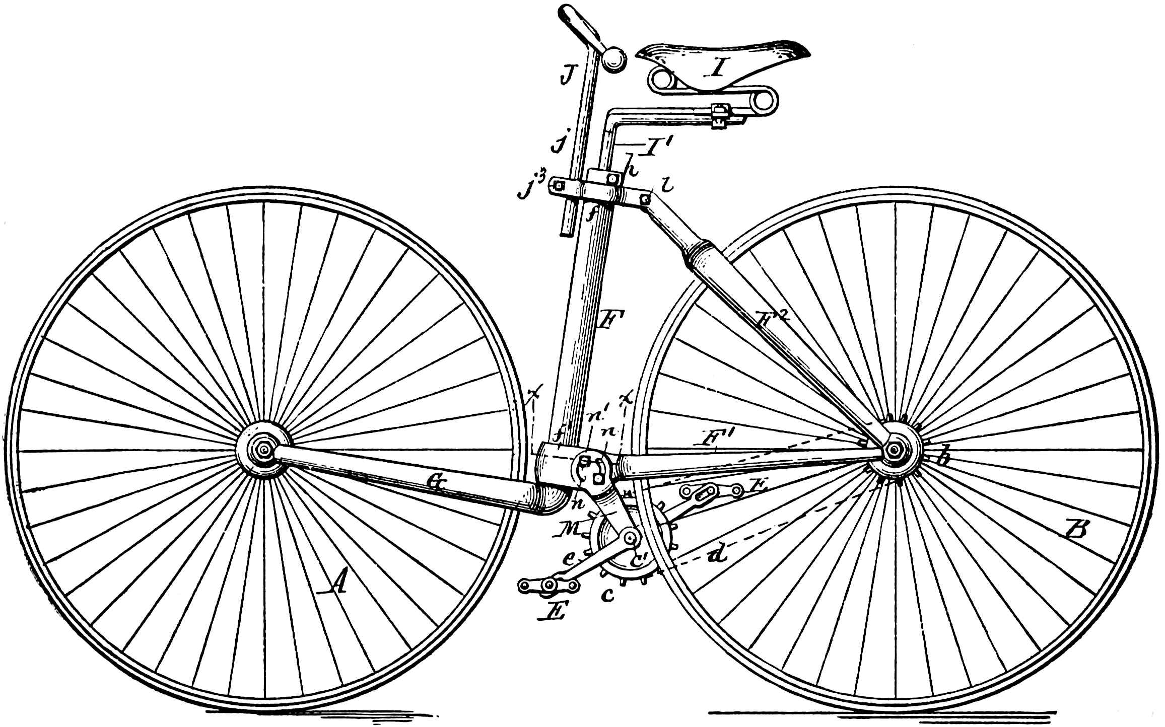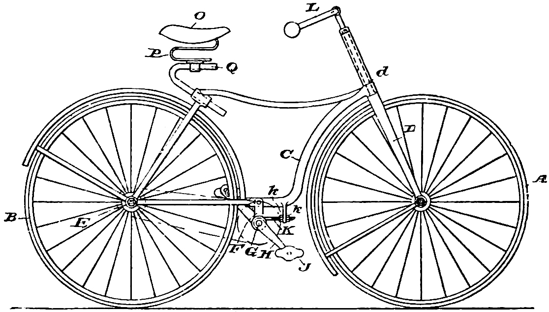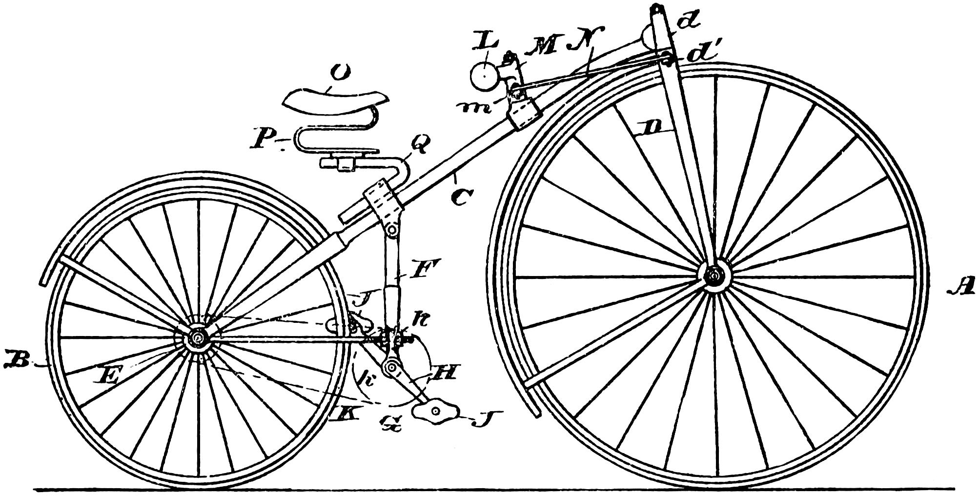 “My invention relates to that class of bicycles in which the front wheel is employed for steering and the rear wheel for driving, the pedal crank-axle being arranged between the wheels and connected with the axle of the rear wheel for driving by an endless driving-chain.