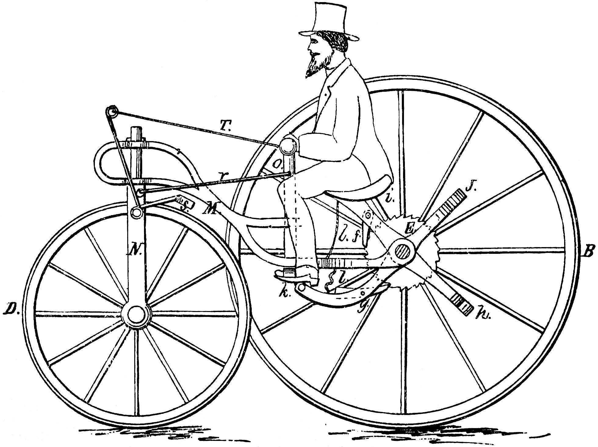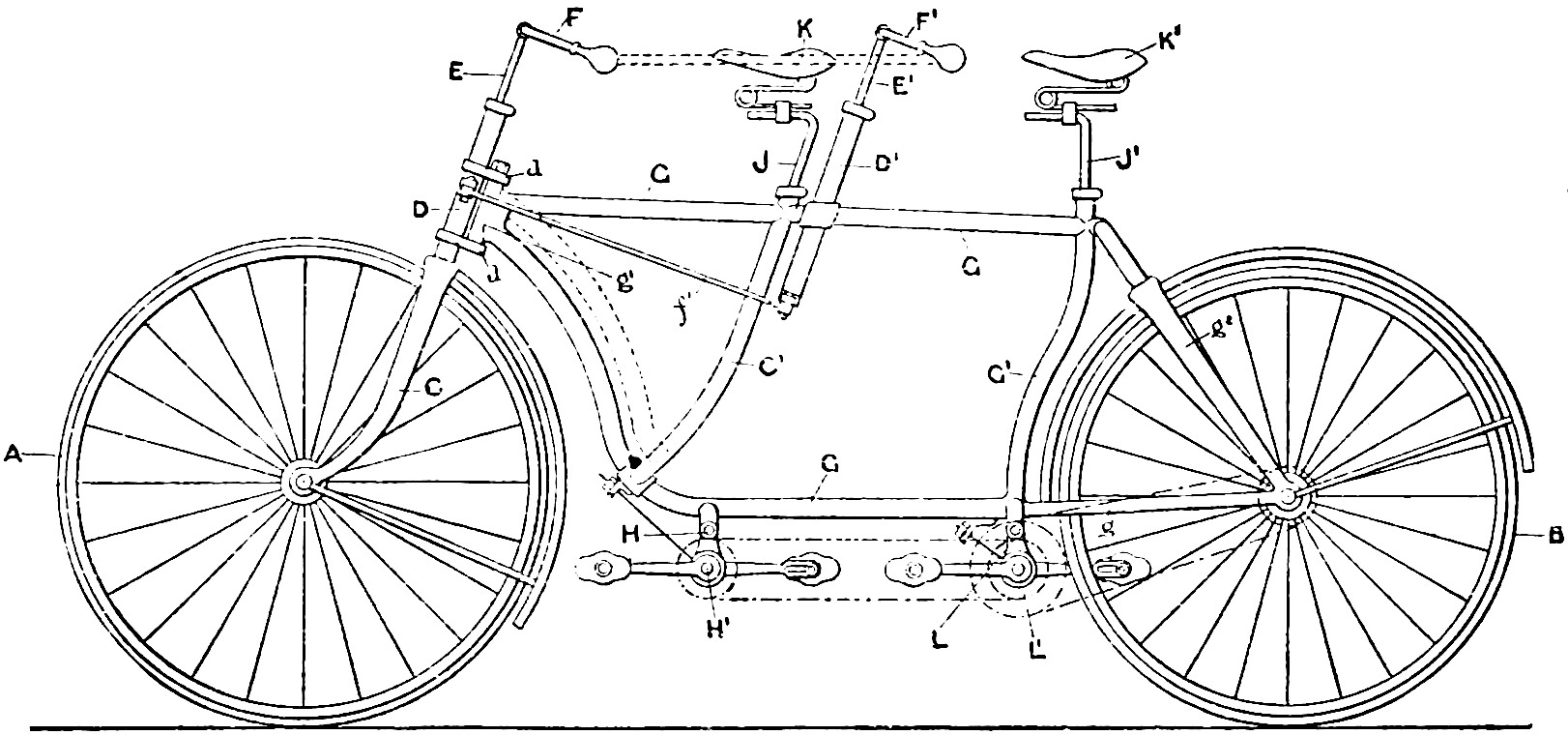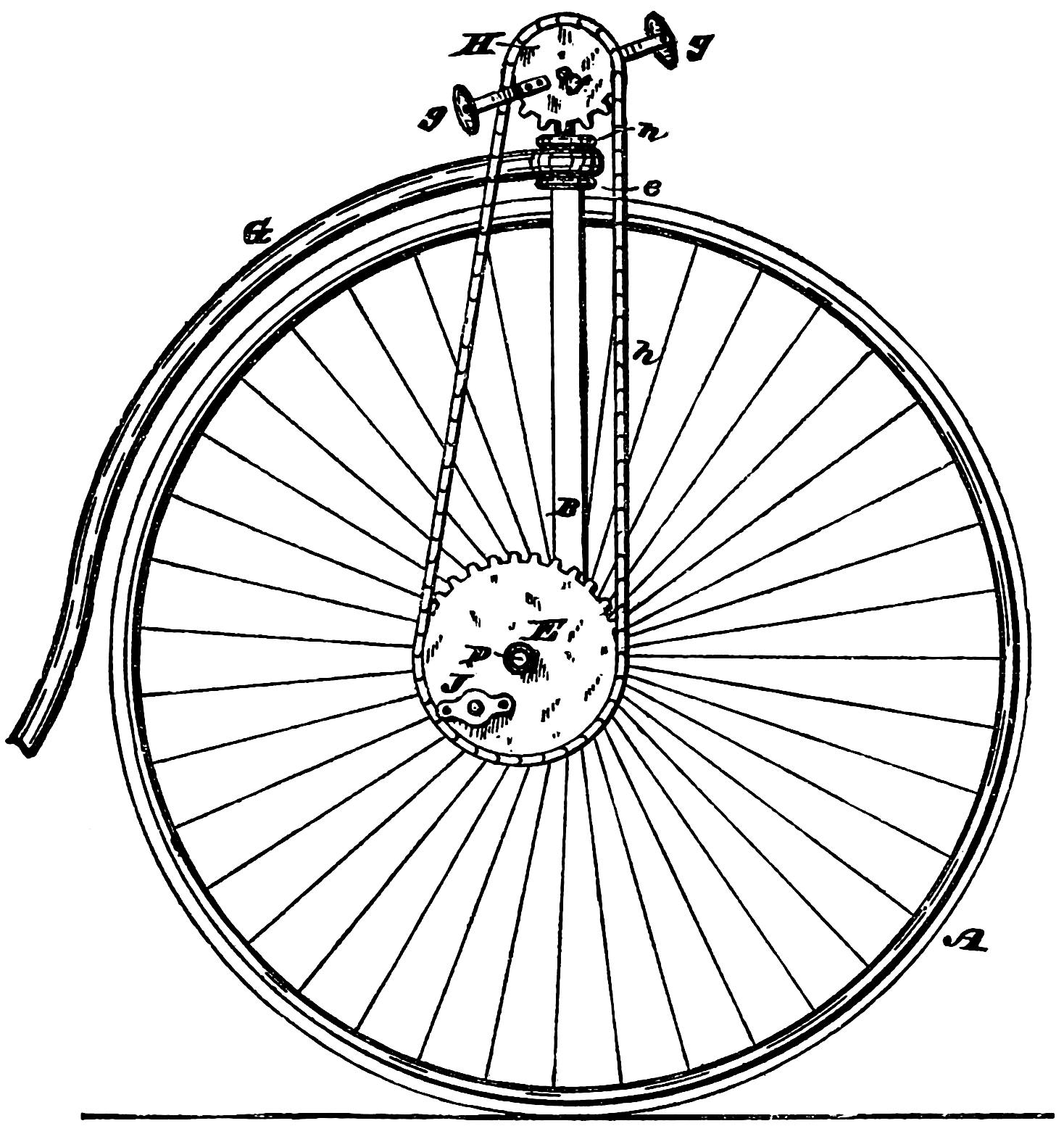 “My invention relates to that class of bicycles in which the front wheel is employed for steering and the rear wheel for driving, the pedal crank-axle being arranged between the wheels and connected with the axle of the rear wheel for driving by an endless driving-chain.