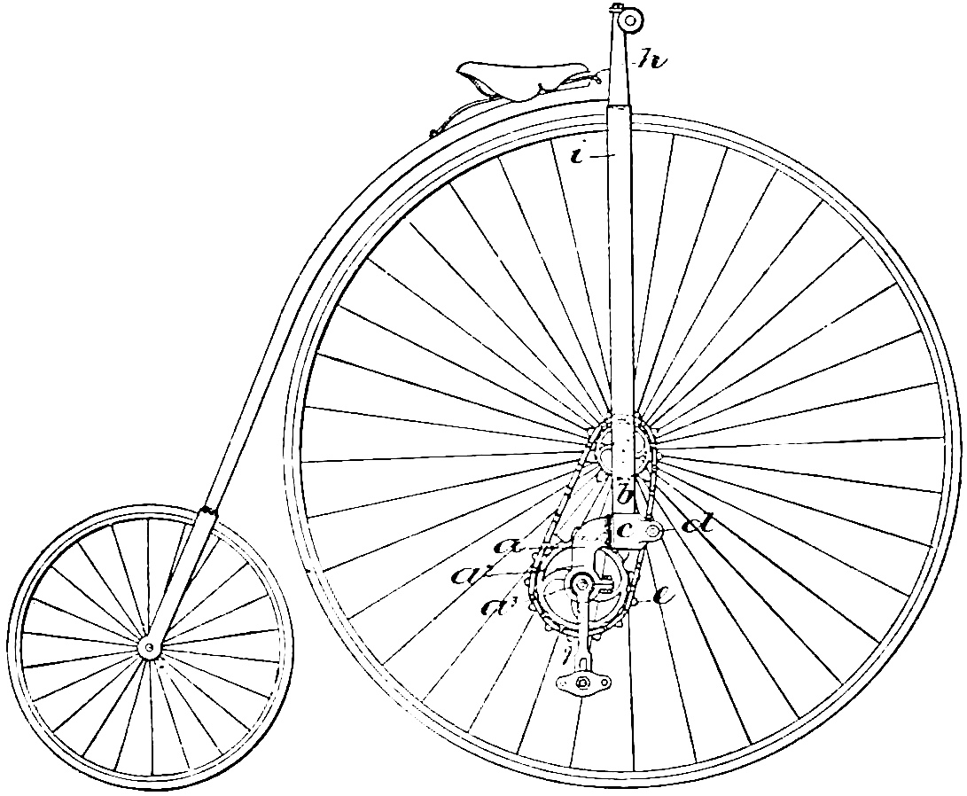 “The object in this construction is to secure the rider against being thrown forward over the front wheel by keeping his centre of gravity low and setting his seat or saddle as far back as is practicable from the centre of the front wheel. This mode of driving through the medium of sprocket-wheels and chains also allows the driving-wheel to be geared up or down to suit individual tastes.