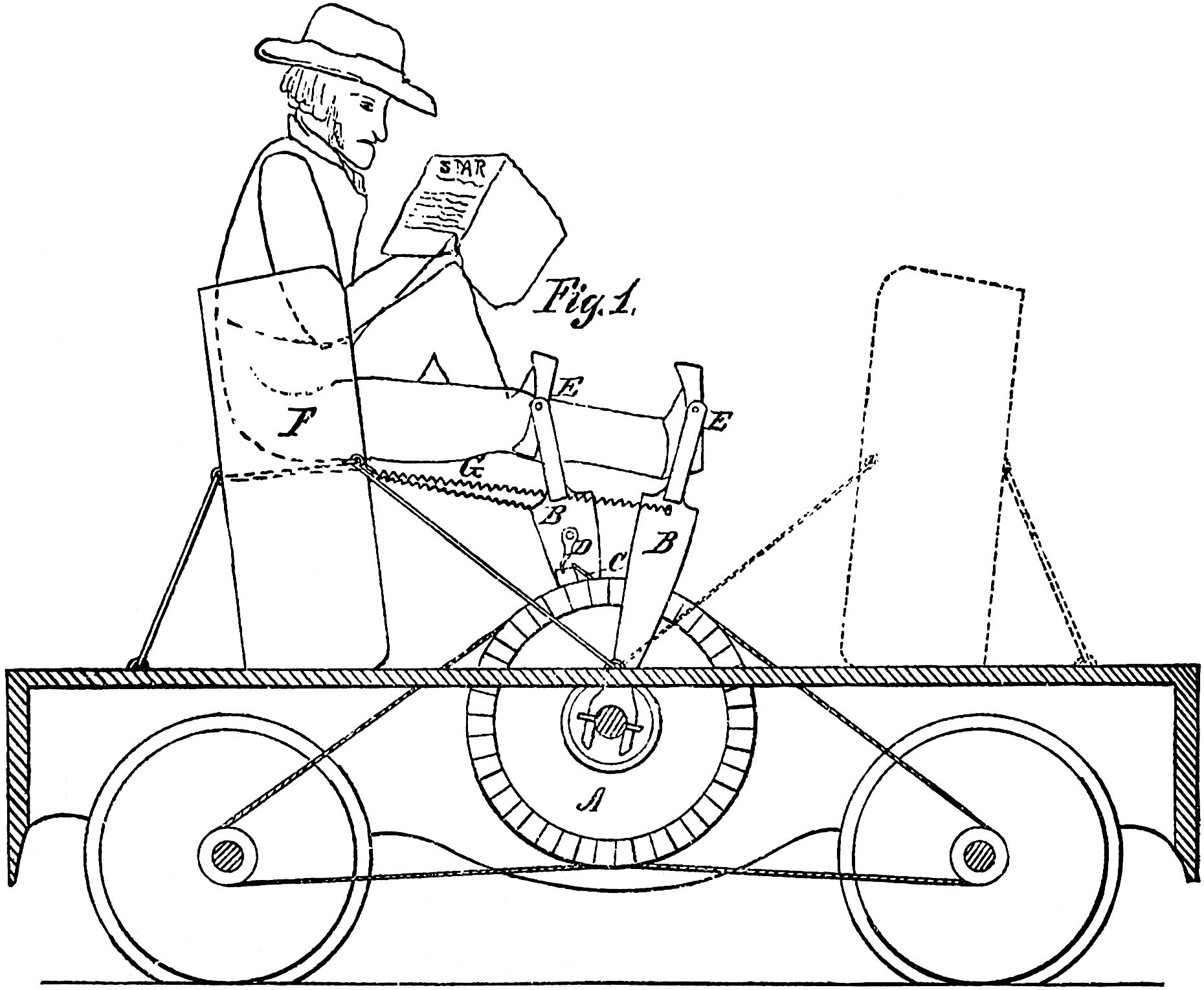 This device works entirely as a manumotor or hand-carriage. It is questionable if any prudent rider would care to be enclosed within this structure if there were many hills to descend. To be sure, if the seat gets fast, he can kick the spokes, as in the case of a squirrel and cage-reel, thus keeping himself upright, but this would be attended with great labor and requisite skill.