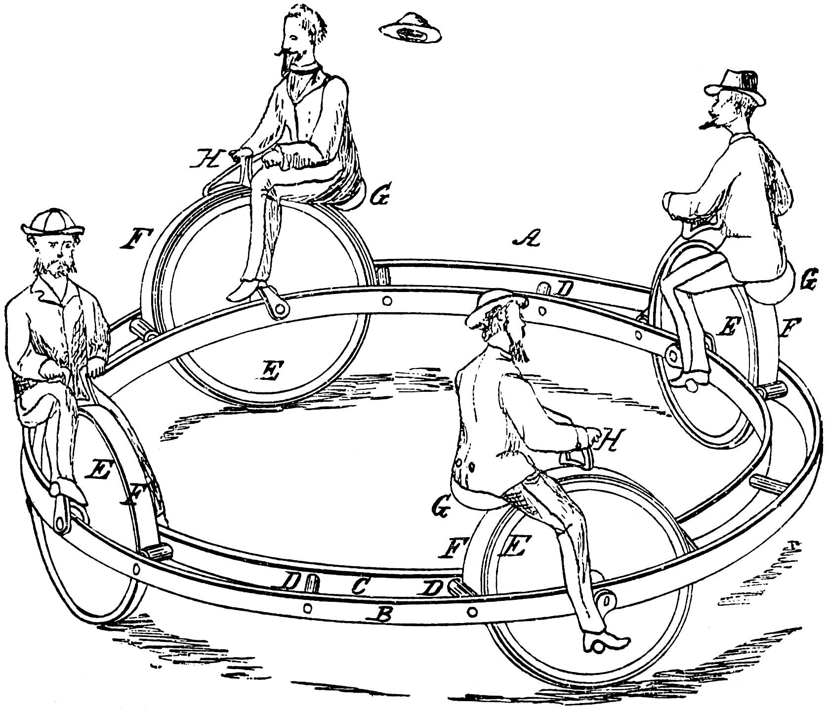 “My invention relates to a unicycle or one-wheeled vehicle, without spokes, which will carry one or more persons, as well as a bicycle or tricycle, and which is operated from within, carries the passenger inside, and only one wheel touching the ground. I attain these objects by the means of the devices illustrated in the accompanying drawings.