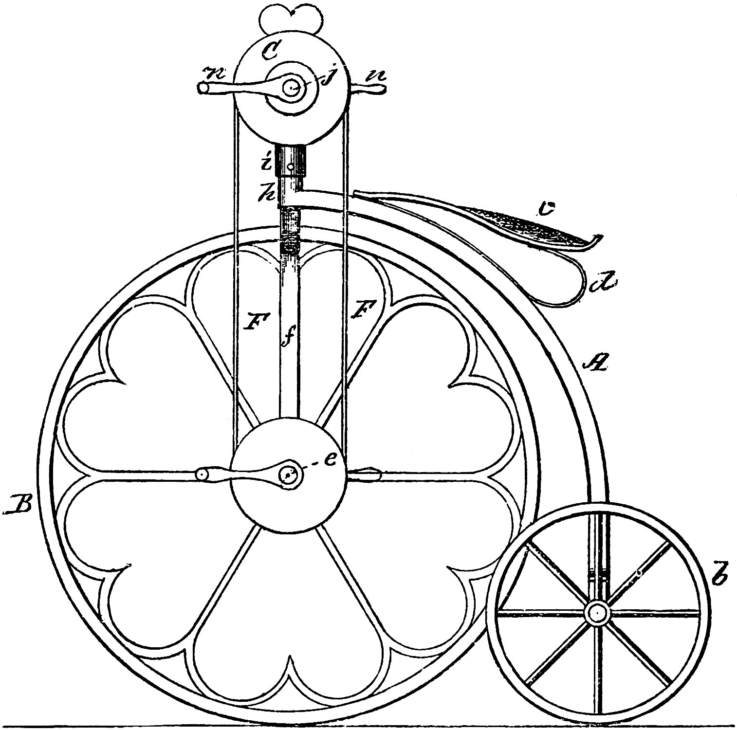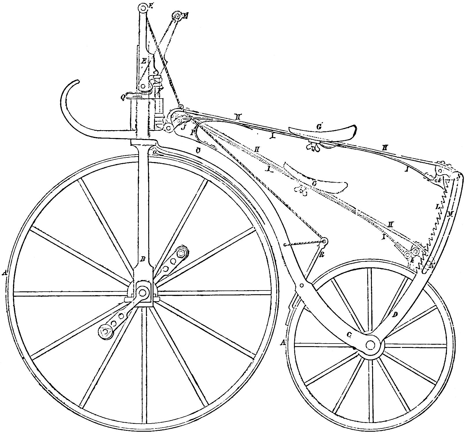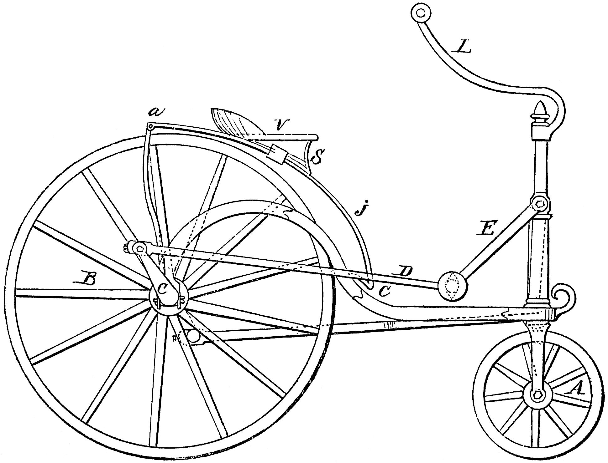 “The combination, in a velocipede, with the driving-wheel, of closed bellows supported on fixed brackets of the fork, forked pedal-rods connected at the lower end of the bottom of the bellows, and at the upper end to a transverse oscillating balance-rod.