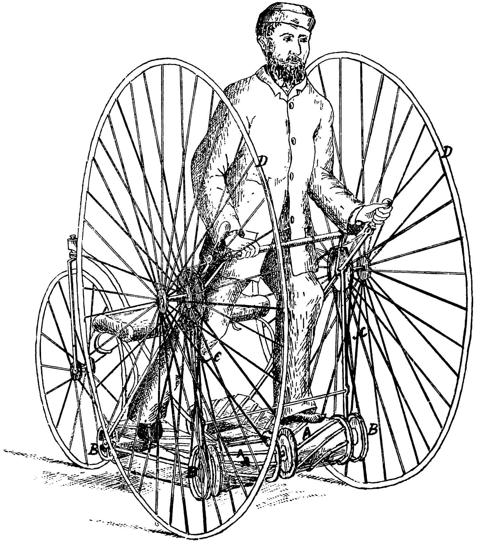 “As shown in Fig. 2, the wheels are upon the same level as the large wheel, and the machine is well supported, so that a person ignorant of the art of riding a bicycle can ride a machine fitted with this appliance.”