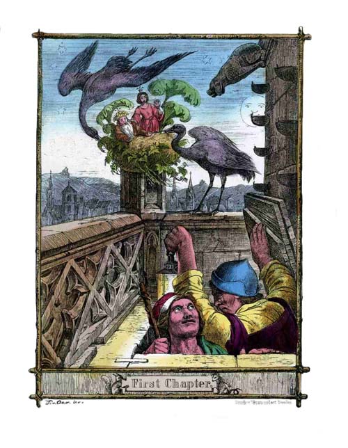 A beautiful new Birds'-nest was therefore immediately selected, cushioned with feathers and moss, and over this was fixed a[4] shadowy roof of leaves, as a shelter from the sun. In this car the Root-King seated himself with the Princess; nor was it forgotten to place in it also a delicate repast of juicy berries, honey, and tender young buds. Two Cranes, who had practised their task for a week previously, took up the nest with their bills, and flew with it through the air to the nearest large Town inhabited by Men.