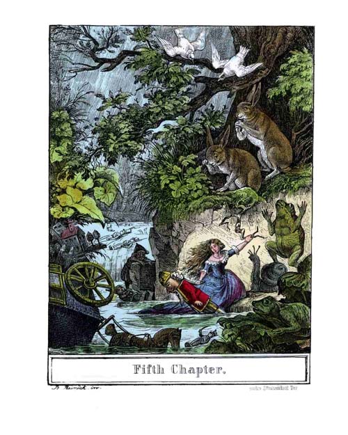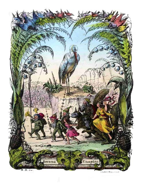 Meanwhile a large fleet of magnetic ships, with tin swans, ducks, and fishes swimming around them, floated in state on the wonderful brook, along the bank of which the procession marched. Now let the Reader picture to himself this interminable multitude advancing in the beautiful green woods, all amidst lilies-of-the-valley, violets and buttercups, lettuce-leaves, nettles, and ferns, marching over hill and dale, in a sparkling sunshine, and with a blue sky overhead,—and withal the toil and efforts of the little wights, the creaking of wheels, the cracking of whips, the word of[18] command resounding through the ranks, the music and singing when the path was smooth and easy, and the cries and shrieks upon the bad roads,—how pretty and animated and merry the whole scene must have been! No wonder indeed that, along the whole way which the procession journeyed, the birds came out of the trees and hedges, the beetles crept out of the flowers, even the worms and snails came out of their hiding-places, all full of curiosity to see the sight; and no wonder too that they were all impressed with great admiration for Prince Nutcracker, who ruled over such a splendid people, and even made long travels with them!
