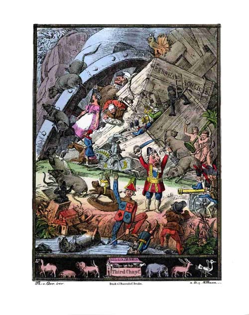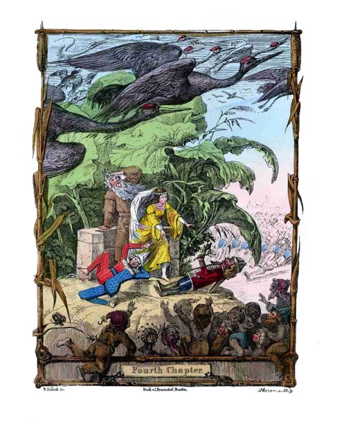 The procession was forthwith marshalled in due order; the Rat prisoners served as pioneers and guides; after these followed the cavalry, then the Prince with all his Court, and behind him the[17] cannons and infantry. Now came rocking-horses, heavily laden with band-boxes, in which were towns, villages, theatres, fortresses, kitchens, and so forth, and all the furniture and cooking utensils; behind these followed the little baggage-waggons, and tin and wooden coaches crammed full of passengers; then people on foot, of all sorts, in every fashion of dress from the time of Adam to the present day. After all these came long droves of animals, large and small, out of all the Noah's-arks and menageries which had been in the waggon,—first the tame and then the wild animals, the latter accompanied by tin Bedouins and Circassians, who had to watch lest the little roaring beasts should devour each other or any other harmless beings. And all the while Harlequins, Scaramouches, and Pantaloons kept jumping and skipping about in the procession, and by their tricks and merriment kept all the people in good heart and humour on the long and arduous march.