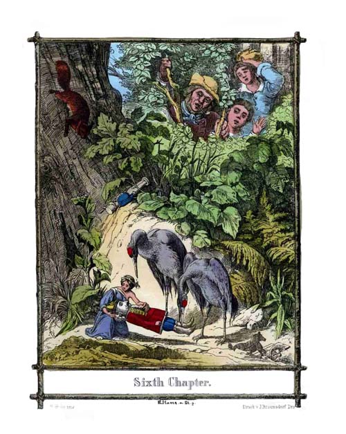 The Cranes alighted with the nest. In an instant the repentant daughter fell on the neck of her overjoyed father, and all the People compassionated her, and forgave her from the bottom[33] of their hearts. In their delight at seeing her again, all were ready to give themselves up to unrestrained rejoicing, but the Princess checked their merriment. She told her People the danger which threatened them of being discovered by Men. Anxiety and terror seized the Rootmen at this news: it was no longer possible to remain in the forest. They at once resolved to leave Root-Valley, and to emigrate by subterranean passages to distant lands.