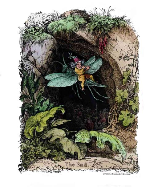 The road between Nuremberg and Leipsic ran in former times, in one part, along the edge of a dark forest, which stretched into the country far over the mountains. In the middle of this forest the rocks enclosed a deep green valley, bordered by almost impenetrable hedges, so that neither man nor beast could enter it. Here dwelt at that time the merry little people of the Rootmen. They were pretty little creatures, in form and look like human beings,—the tallest about six inches high, and the smallest as long as your little finger. In summer they lived in mossy bowers and under the leaves of the tall fern; in winter they nestled among the roots[2] of trees, in the holes of some gnarled old trunk, and crept into the clefts in the rocks. Their dress was fine and elegant: the little men wore coats and hose of moss, and the little women dresses of pretty variegated flowers, leaves, and gossamer, according as the weather was warm or cold. They never felt the time long, having always plenty of employment; they had to keep their roads in order, gather in their stores, and the like; their favourite pastimes were climbing and jumping, and arranging grand water-parties in nutshells upon the brook which ran through their country. At other times they would play at Hunt-the-hare with the Grasshoppers and May-beetles, and dance the most graceful dances to the song of the Birds: nor must it be forgotten that they understood the language of all living creatures.
