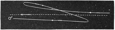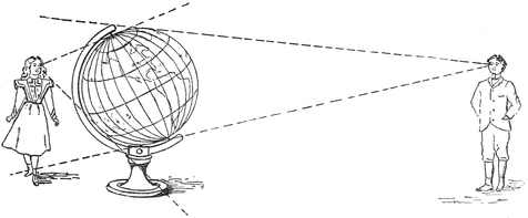 I shall so often have to speak of the distances of the celestial bodies that I may once for all explain how it is that we have been able to discover what these distances are. This would be a very puzzling matter if we were to try and describe it fully, but the principle of the method is not at all difficult. Do you know why you have been provided with two eyes? It is undoubted that one of the reasons is to aid you in estimating distances. You see this boy (Fig. 4) judges of the distance of his finger by the inclination of his two eyes when directed at it. In a similar way we judge of the distance of a heavenly body by making observations on it from two different stations.