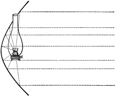 We may use one of those large lenses that are intended for magnifying photographs. But almost any kind of lens will do, except it be too flat, as those in spectacles generally are. On a fine sunny day in summer, you turn the burning-glass to the sun, and by4 holding a piece of paper at the proper distance a bright spot will be obtained (Fig. 1). At that spot there is intense heat, by which a match can be lighted, gunpowder exploded, or the paper itself kindled. The broad lens collects together the rays from the sun that fall upon it, and concentrates them in one spot, which consequently becomes hot and bright. If we merely used a flat piece of glass the sunbeams would go5 straight through; they would not be gathered together, and they would not be strong enough to burn the paper. The lens, you see, is not flat; its faces are curved, and they thus acquire the power of bending in rays of light or heat, so as to unite their effect on that one point which we call the focus. When a great number of rays are thus collected on the same spot, each of them contributes a little warmth.