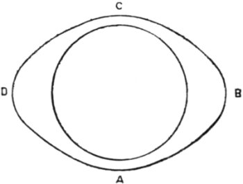 The first question then is, as to how these two opposite heaps of water are placed in respect to the position of the moon. The most obvious explanation would seem to be, that the moon should pull the waters up into a heap directly underneath it, and that therefore there should be high water underneath the moon. As to the other side, the presence of a high tide there was, on this theory, to be accounted for by the fact that the moon pulled the earth away from the waters on the more[20] remote side, just as it pulled the waters away from the more remote earth on the side underneath the moon. It is, however, certainly not the case that the high tide is situated in the simple position that this law would indicate, and which we have represented in Fig. 1, where the circular body is the earth, the ocean surrounding which is distorted by the action of the tides.