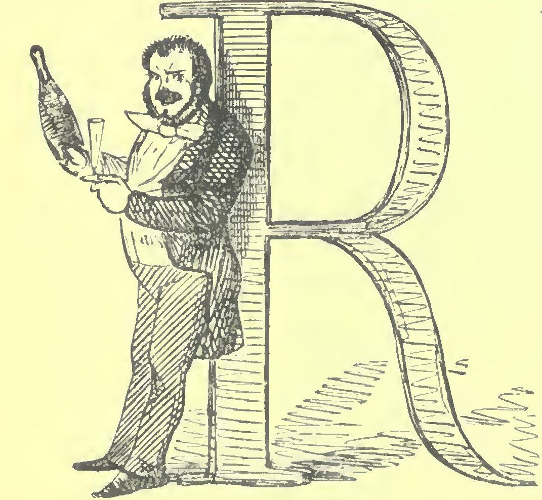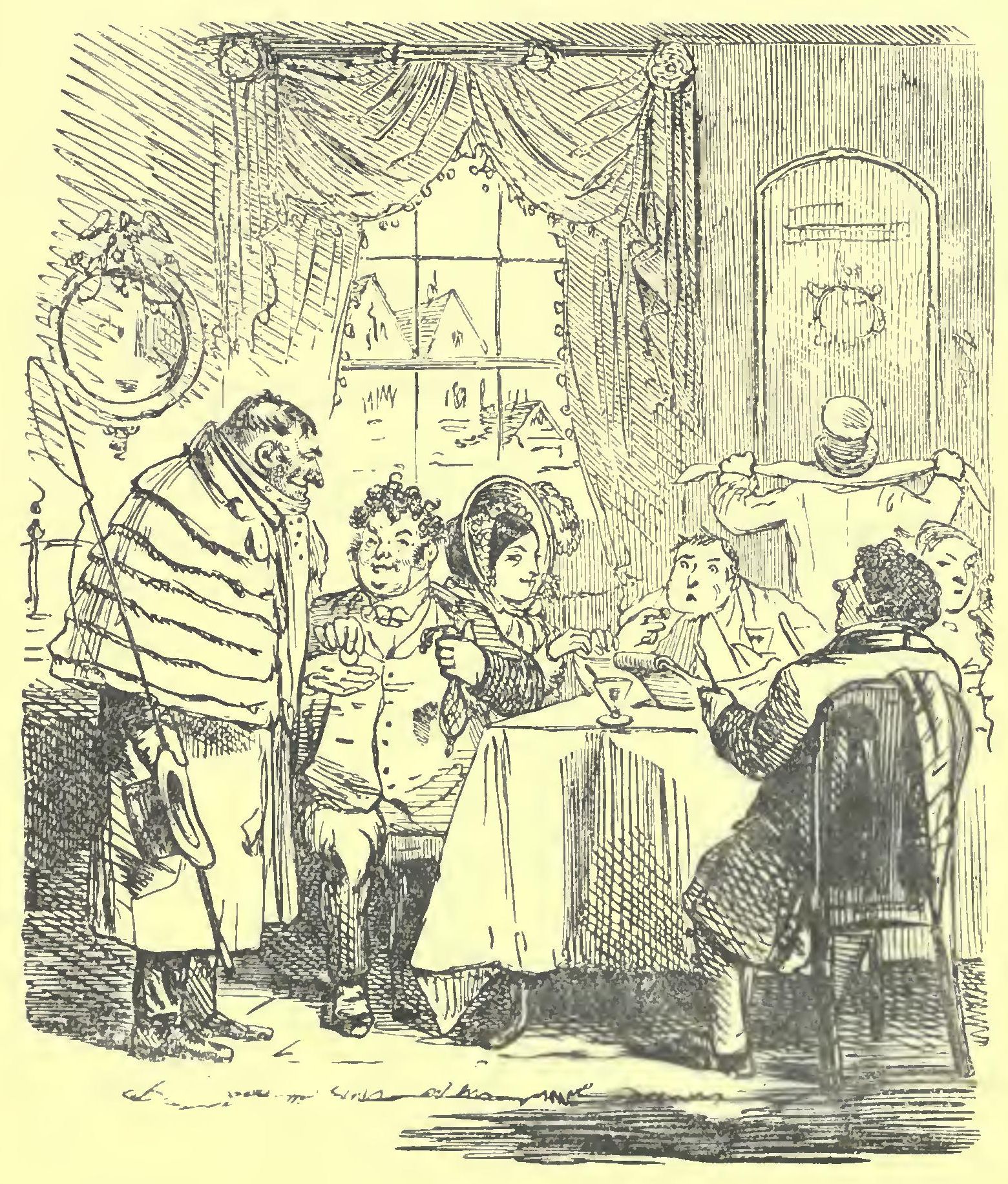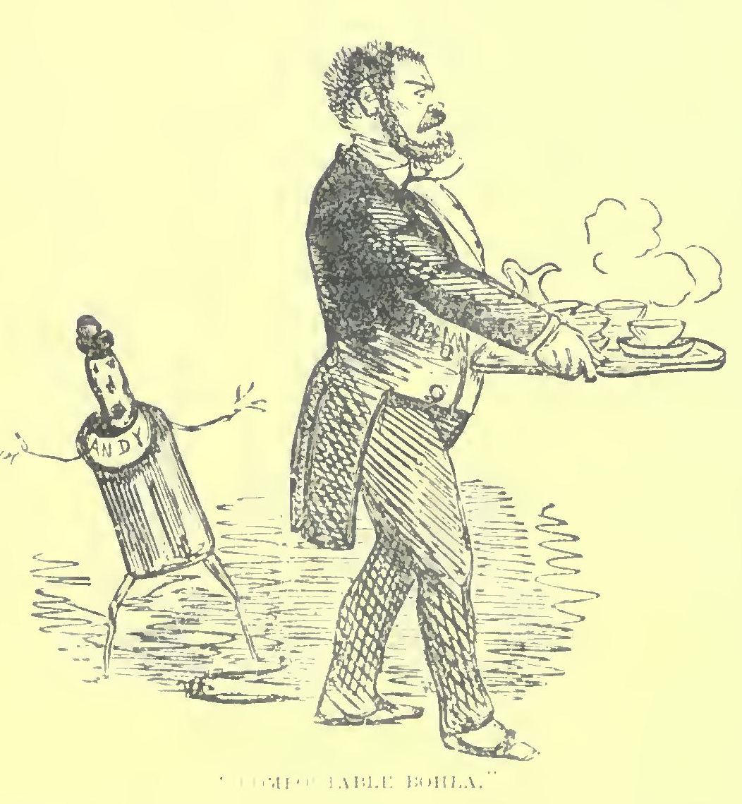 Pork was the repast. Pork in varions shapes: roast at the top, boiled at the bottom, sausages on one side, fry on the other; and Miss Willing couldn’t eat pork, and, curious coincidence! neither could Billy. The lady having intimated this to Billy in the most delicate way possible, for she had a particular reason for not wishing to aggravate the new landlord, Mr. Bouncible, Billy gladly sallied forth to give battle as it were on his own account, and by way of impressing the household with his consequence, he ordered a bottle of Teneriffe as he passed the bar, and then commenced a furious onslaught about the food when he got into the kitchen. This reading of the riot act brought Bouncible from his “Times,” who having been in the profession himself took Billy for a nobleman’s gentleman, or a house-steward at least—a class of men not so easily put upon as their masters. He therefore, after sundry regrets at the fare not being ‘zactly to their mind, which he attributed to its being washing-day, offered to let them have the first turn at a very nice dish of hashed venison that was then simmering on the fire for Mrs. B. and himself, provided our travellers would have the goodness to call it hashed mutton, so that it might not be devoured by the outsiders, a class of people whom all landlords held in great contempt. To this proposition Billy readily assented, and returned triumphantly to the object of his adoration. He then slashed right and left at the roast pork, and had every plate but hers full by the time the hashed mutton made its appearance. He then culled out all the delicate tit-bits for his fair partner, and decked her hot plate with sweet sauce and mealy potatoes. Billy’s turn came next, and amidst demands for malt liquor and the arrival of smoking tumblers of brown brandy and water, clatter, patter, clatter, patter, became the order of the day, with an occasional suspicious, not to say dissatisfied, glance of a pork-eating passenger at the savoury dish at the top of the table. Mr. Bonncible, however, brought in the Teneriffe just at the critical moment, when Billy having replenished both plates, the pork-eaters might have expected to be let in; and walked off with the dish in exchange for the decanter. Our friends then pledged each other in a bumper of Cape. The pork was followed by an extremely large strong-smelling Cheshire cheese, in a high wooden cradle, which in its turn was followed by an extremely large strong-smelling man in a mountainous many-caped greatcoat, who with a bob of his head and a kick out behind, intimated that paying time was come for him. Growls were then heard of its not being half an hour, or of not having had their full time, accompanied by dives into the pockets and reticules for the needful—each person wondering how little he could give without a snubbing.