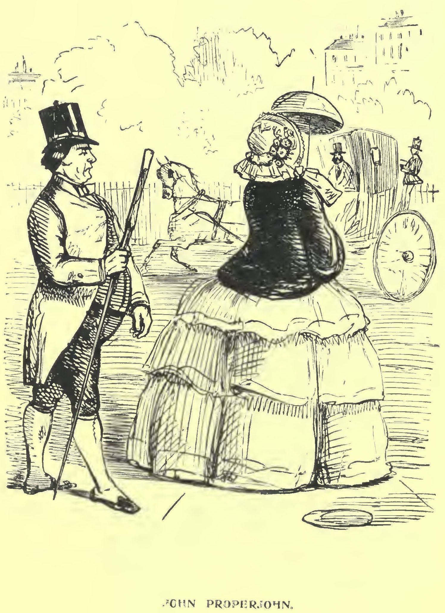 Mrs. Roseworth then following, afforded astonished John a moment to collect his scattered faculties, yet not sufficient time to compare the dread. “Si-r-r-r! do you mean to insult me!” of their former meeting, with the cordial greeting of this. Indeed, our fair friend felt that she had a great arrear of politeness to make up, and as railway time is short, she immediately began to ply her arts by inquiring most kindly after His Highness’s sister Mrs. Poppeyfield and her baby, who she heard was such a sweet boy; and went on so affably, that before Billy Bates arrived with the tickets, which Mrs. Roseworth had forgotten to take, Imperial John began to think that there must have been some mistake before, and Miss de Glancey couldn’t have understood him. Then, when the train was again in motion, she applied the artillery of her eyes so well—for she was as great an adept in her art as the Northumberland horse-tamer is in his—that ere they stopped at the Lanecroft station, she had again subjugated Imperial John;—taken his Imperial reason prisoner! Nay more, though he was going to Bowerbank to look at a bull, she actually persuaded him to alight and accompany her to Mrs. Roseworth’s where we need scarcely say he was presently secured, and in less than a week she had him so tame that she could lead him about, anywhere.