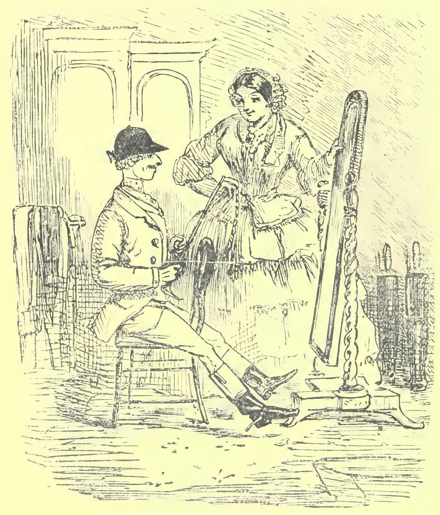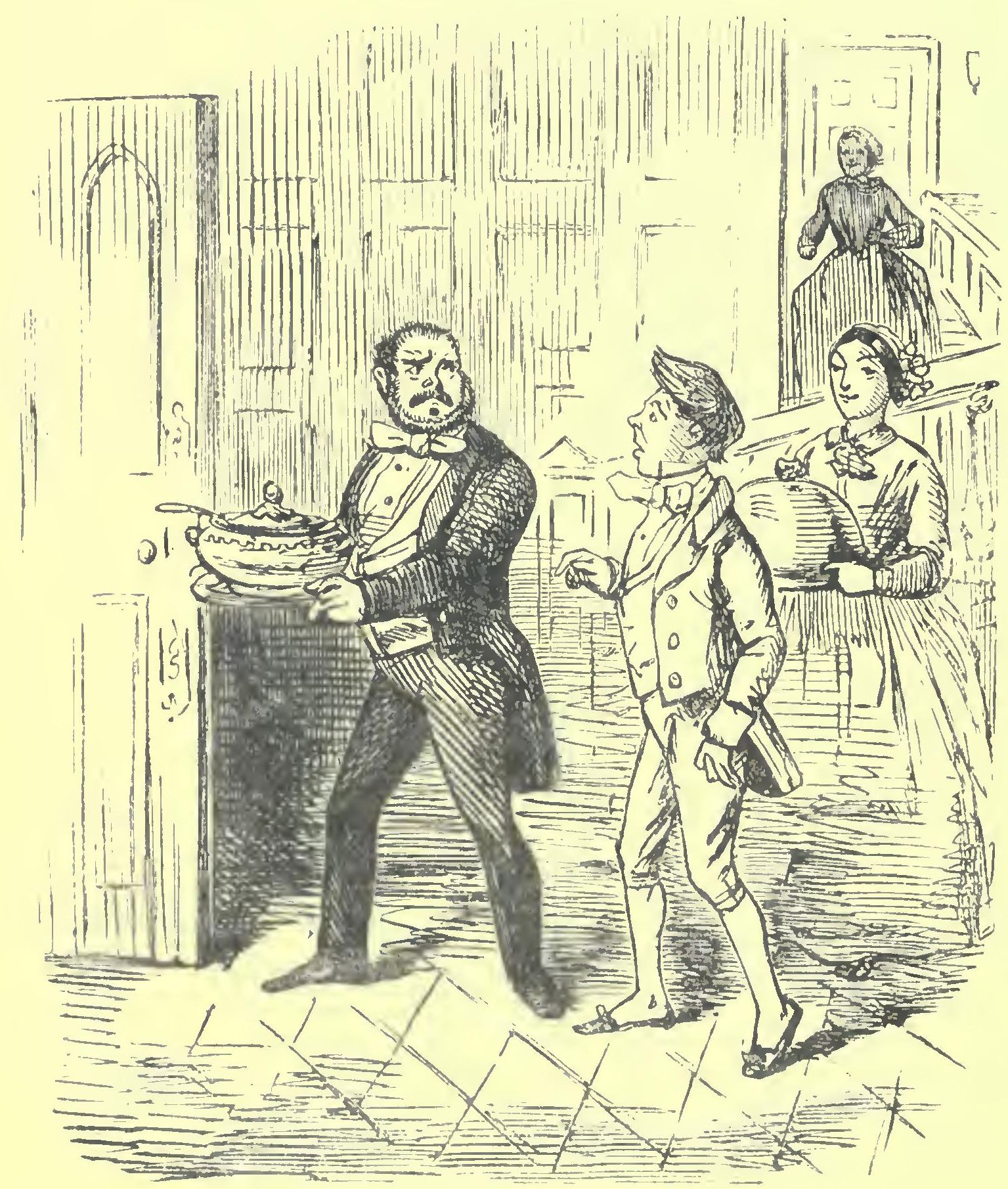 This advertisement produced a goodly crop of letters, and Miss Willing presently closed with the Honourable Mrs. Cavesson, whose husband was a good deal connected with the turf, enjoying that certain road to ruin which so many have pursued; and it says much for Miss Willing’s acuteness, that though she entered Mrs. Cavesson’s service late in the day, when all the preliminaries for a smash had been perfected, her fine sensibilities and discrimination enabled her to anticipate the coming evil, and to deposit her mistress’s jewellery in a place of safety three-quarters of an hour before the bailiffs entered. This act of fidelity greatly enhanced her reputation, and as it was well known that “poor dear Mrs. Cavesson” would not be able to keep her, there were several great candidates for this “treasure of a maid.” Miss Willing had now nothing to do but pick and choose; and after some consideration, she selected what she called a high quality family, one where there was a regular assessed tax-paper establishment of servants, where the butler sold his lord’s wine-custom to the highest bidder, and the heads of all the departments received their “reglars” upon the tradesmen’s bills; the lady never demeaning herself by wearing the same gloves or ball-shoes twice, or propitiating the nurse by presents of raiment that was undoubtedly hers—we mean the maid’s. She was a real lady, in the proper acceptation of the term.