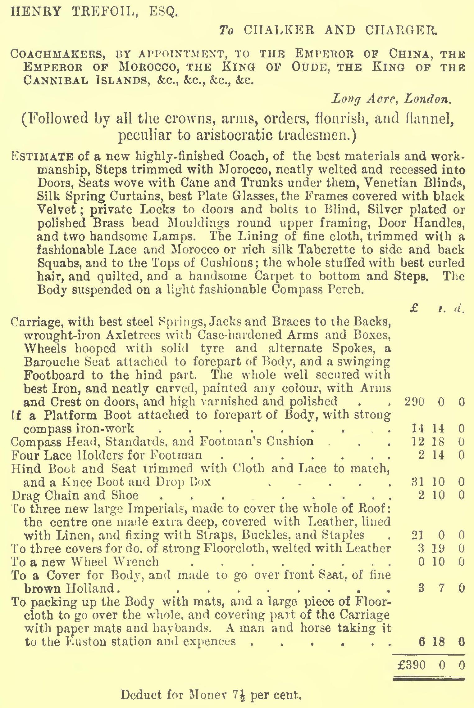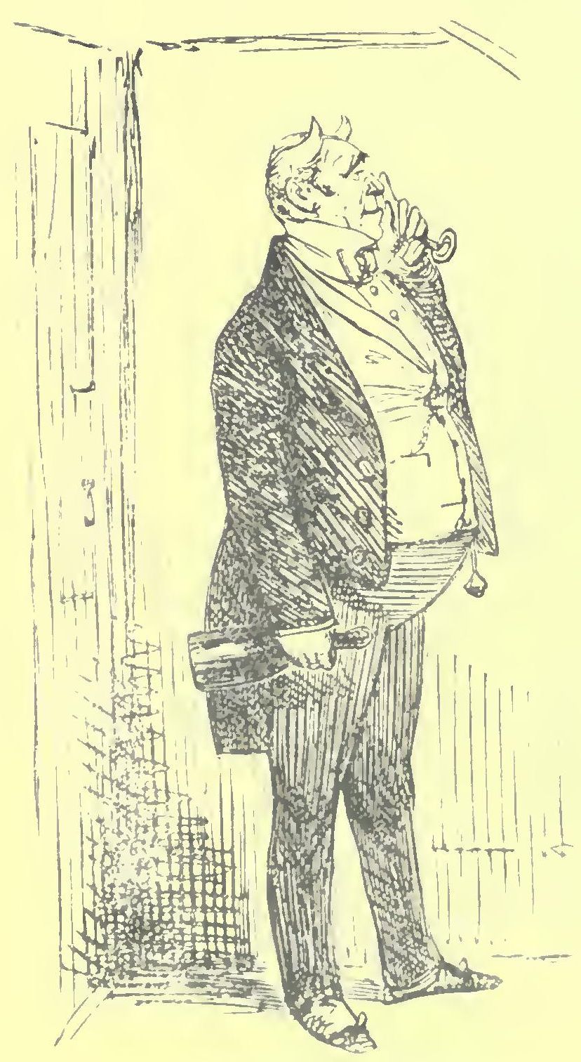 In the dress department he was ably assisted by his mother, a lady of very considerable taste, who not only fashioned his clothes but his mind, indeed we might add his person, Billy having taken after her, as they say; for his father, though an excellent man and warm, was rather of the suet-dumpling order of architecture, short, thick, and round, with a neck that was rather difficult to find. His name, too, was William, and some, the good-natured ones again of course, used to say that he might have been called “Fine Billy the first,” for under the auspices of his elegant wife he had assumed a certain indifference to trade; and when in the grand strut at Ramsgate or Broadstairs, or any of his watering-places, if appealed to about any of the things made or dealt in by any of the concerns in which he was a “Co.,” he used to raise his brows and shrug his shoulders, and say with a very deprecatory sort of air, “‘Pon my life, I should say you’re right,” or “‘Deed I should say it was so,” just as if he was one of the other Pringles,—the Pringles who have nothing to do with trade,—and in noways connected with Pringle & Co.; Pringle & Potts; Smith, Sharp & Pringle; or any of the firms that the Pringles carried on under the titles of the original founders. He was neither a tradesman nor a gentleman. The Pringles—like the happy united family we meet upon wheels; the dove nestling with the gorged cat, and so on—all pulled well together when there was a common victim to plunder; and kept their hands in by what they called taking fair advantages of each other, that is to say, cheating each other, when there was not.
