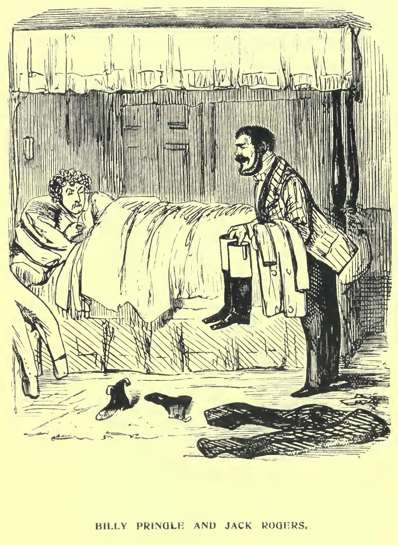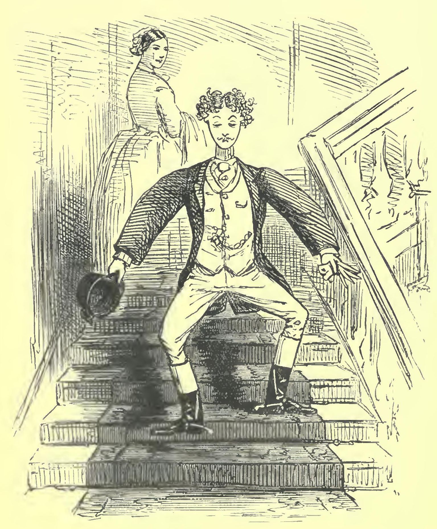 Now, it so happened that the train was in charge of the well-known Billy Bates, a smart young fellow, whose good looks had sadly stood in the way of his preferment, for he never could settle to anything; and after having been a footman, a whipper-in, a watcher, a groom, and a grocer, he had now taken up with the rail, where he was a great favourite with the fair, whom he rather prided himself upon pairing with what he considered appropriate partners. Seeing our lovely coquette peeping out, it immediately occurred to him, that he had a suitable vis-à-vis for her—a dashing looking gent., in a red flannel Emperor shirt, a blue satin cravat, a buff vest, aud a new bright-green cut-away with fancy buttons; altogether a sort of swell that isn’t to be seen every day.