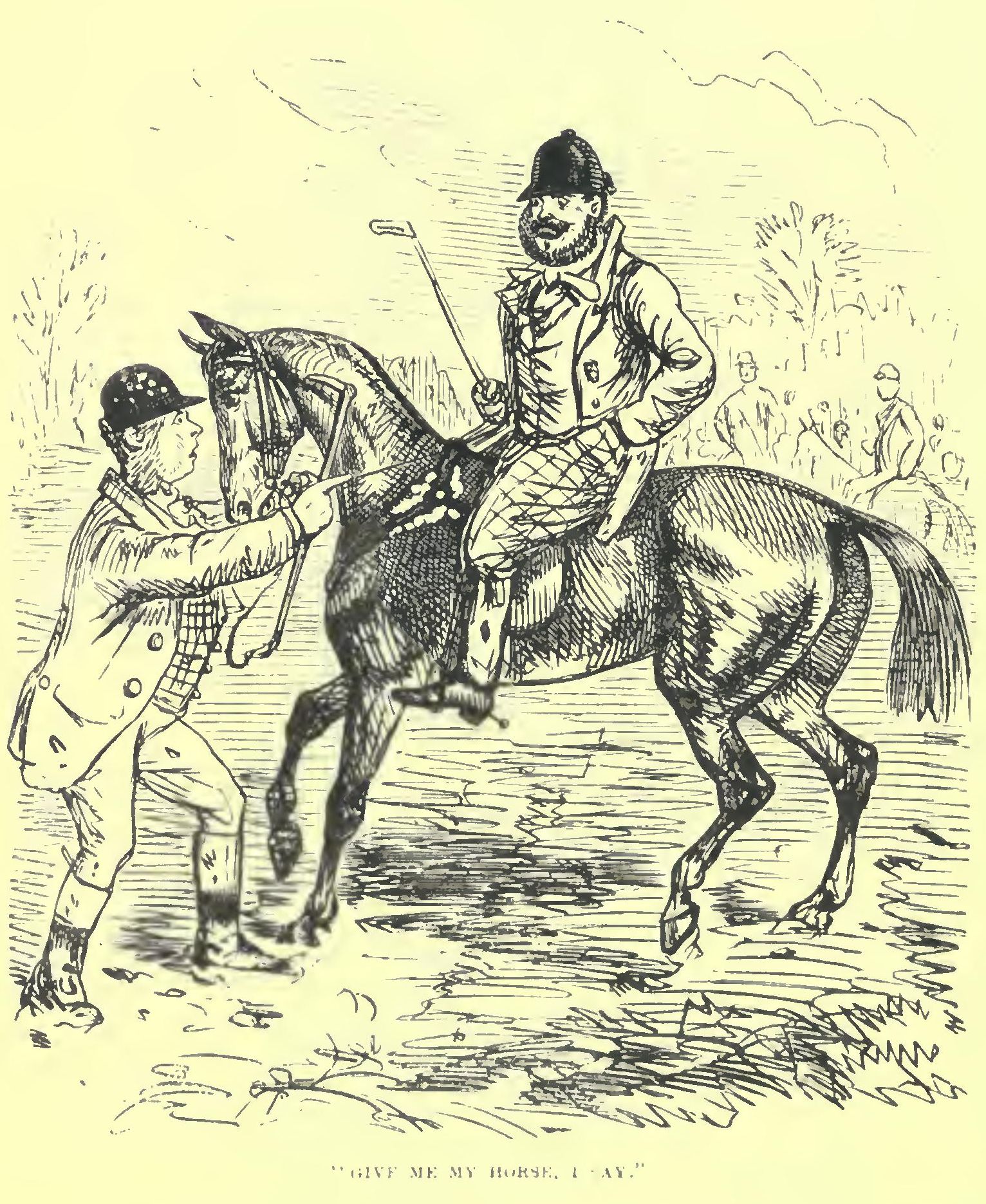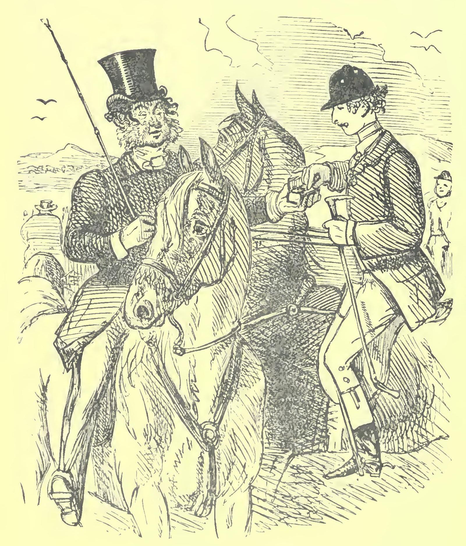 Gallon then coaxed Tippy Turn round, and, retracing his steps as far as Kimberley gate, paid the toll, and shot Mrs. Margerum out, telling her to make the best of her way back to the Rose and Crown, and stay there till he returned. Gallon then took the road to the right, leading on to the wide-extending Spankerley Downs; where, unharnessing Tippy Tom under lea of a secluded plantation, he produced a saddle and bridle from the back of the cart, which, putting on, he mounted the high-stepping white, and was presently among the coursers, the greatest man at the meeting, some of the yokels, indeed, taking him for Sir Harry Fuzball himself.