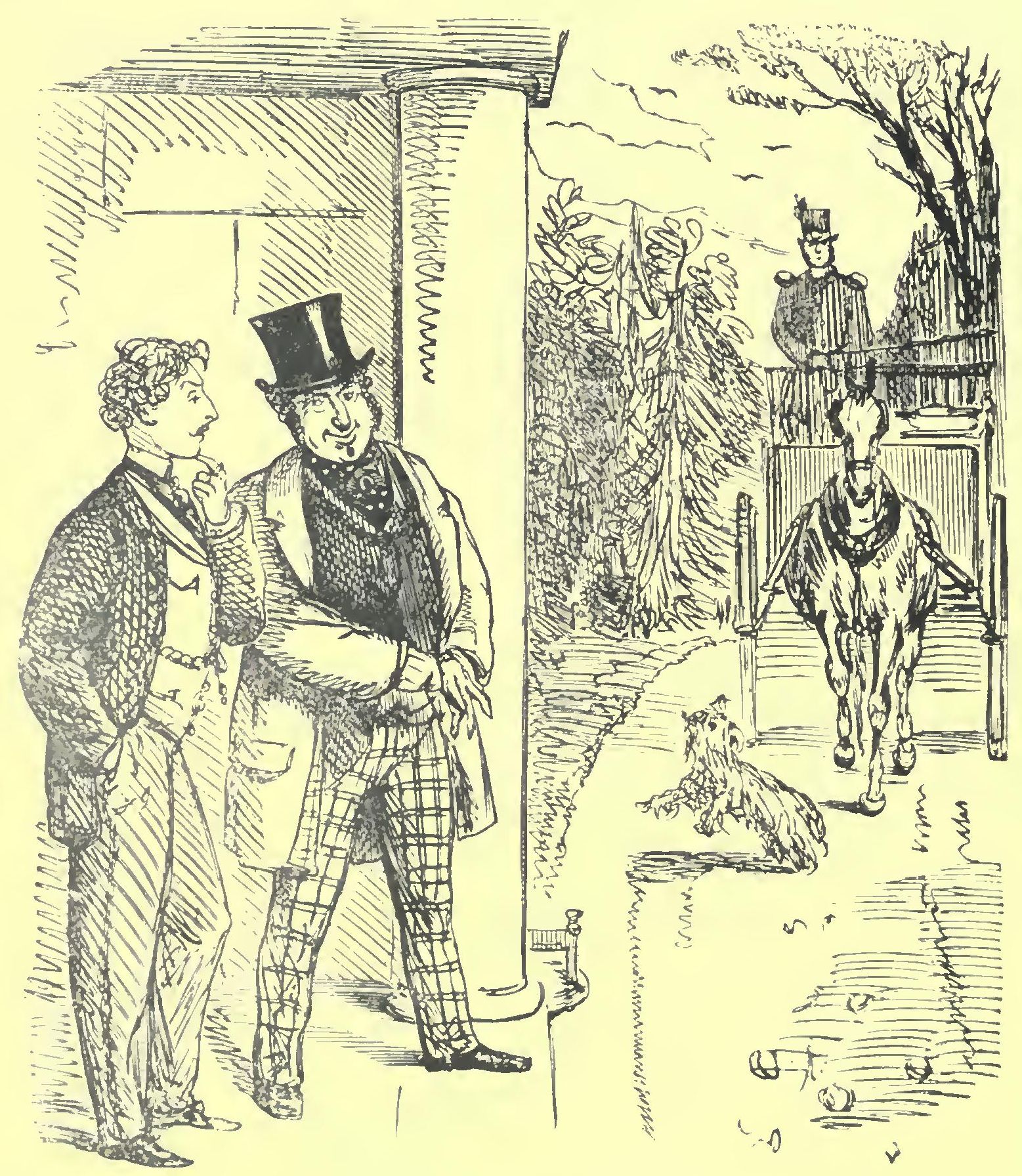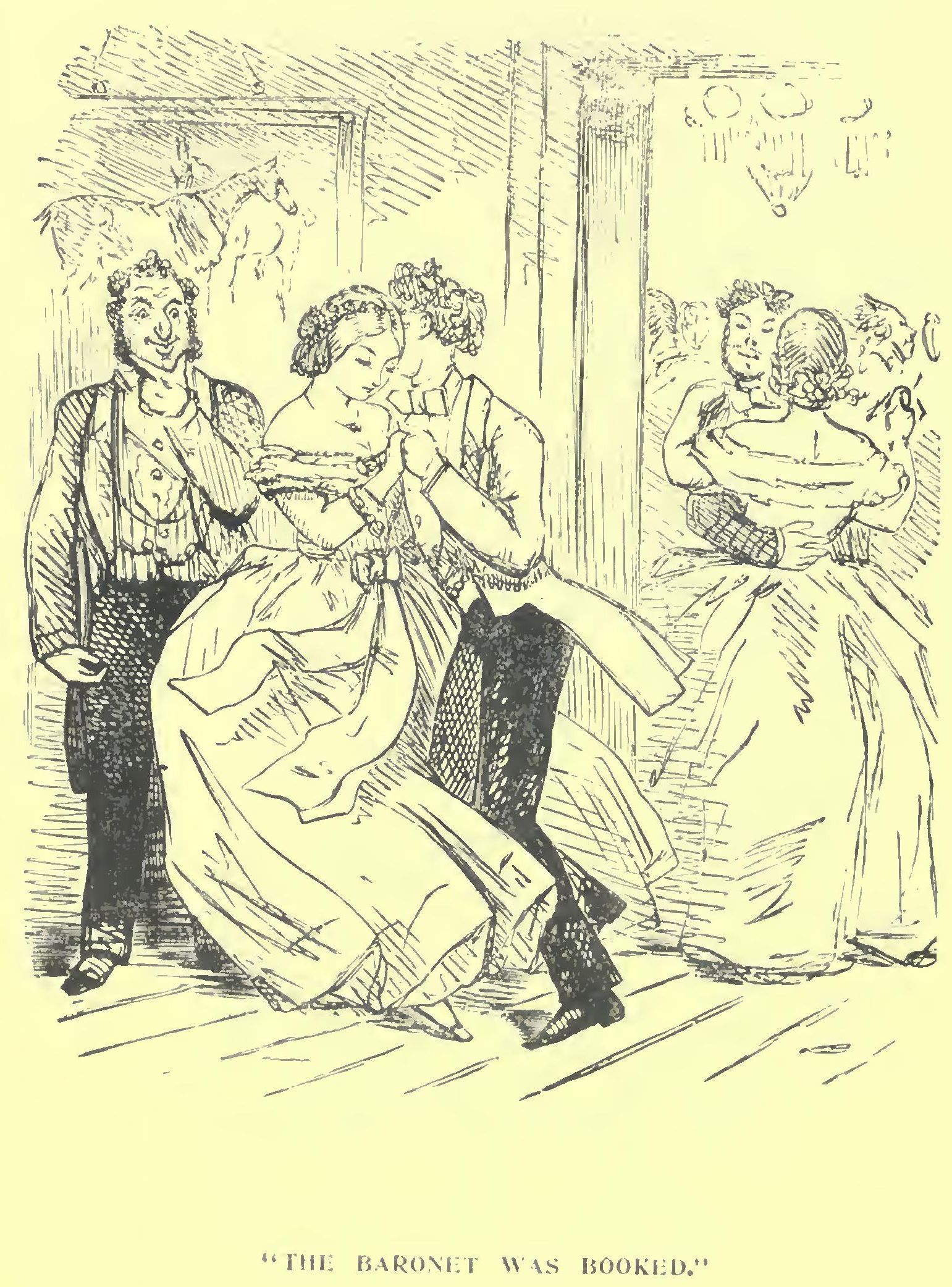 Among the many visited on this auspicious day were our fair friends at Yammerton Grange, our Richest Commoner having infused a considerable degree of activity into the matrimonial market. There is nothing like a little competition for putting young gentlemen on the alert. First to arrive was our friend Sir Moses Mainchance, who dashed up to the door in his gig with the air of a man on safe ground, saluting Mamma whom he found alone in the drawing-room, and then the young ladies as they severally entered in succession. Having thus sealed and delivered himself into the family, as it were, he enlarged on the delights of the ball—the charming scene, the delightful music, the excellent dancing, the sudden disappearance of de Glancey and other the incidents of the evening. These topics being duly discussed, and cake and wine produced, “Mamma” presently withdrew, her example being followed at intervals by Flora and Harriet.