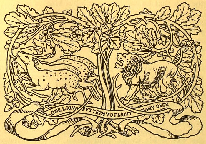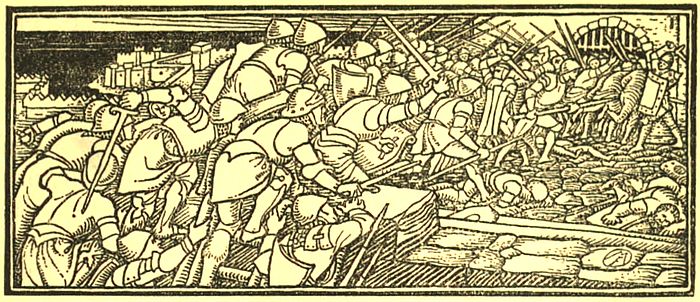Then marched the host on its way and at the last it came near the country of the ambassadors where the abominable dwarfs were, and when they came there the ambassadors went forward to bring the news of the coming of the Greeks. It chanced that the third day after the coming of the ambassadors was a feast of the dwarf-folk, and all the men of that country kept the news of the coming of the Greeks from them so that they met in all their number in one place. It was of custom among them that every feast some one should be slain in torment that the chief men of the dwarf-folk might give a presage of what should befall the folk, and that feast one of them was to be slain for he had given food to a man that was starving in a prison cell. So the ambassadors returned and told Alexander what was to be done; and he deemed it well to fall on them when they were all in one place. And this he did, and the fight was long and sore between him and the dwarfs, for the dwarfs were so small that they escaped the lance point, and they ran under the horses and houghed them, and their skins were so tough that the arrows glanced off them, if they did not hit straight, and the sword edges slipped, but the claws of the dwarfs and their teeth and their arrows availed them little against the armour of the Macedonians.