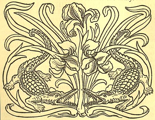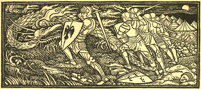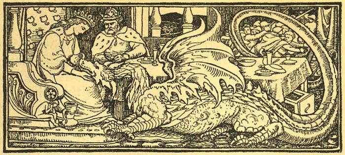 So Philip came home with much joy, honoured of men, and when he met his queen he kissed her fair, and they spoke of their dreams, and of what the god had promised them. And it fell that two wonders happened to them. For one day as they sat at meat in the hall, and folk around them great and small, a great dragon came into the palace, and men fled, save some that drew sword and turned pale, but the king cried out: “Faith, but this is the noble dragon that turned the fight for us that other even.” Then the king was glad, but the great worm came slowly up the hall till it reached the queen, and[18] there it raised its head on her knees, and she knew it for the dragon that had come to her, and lifted its head and kissed it, and all men looked for some change; but the dragon turned and went its way out as it came in, and those outside saw nought save the Egyptian diviner standing at the gate.