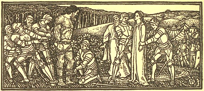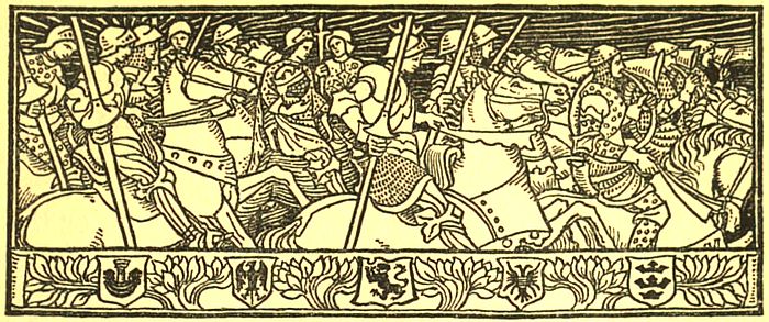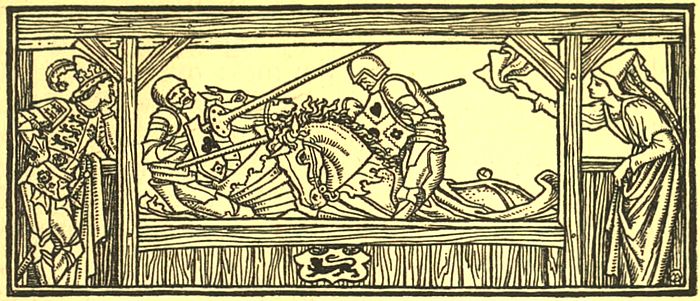 When the morrow came all men went again to their places, and the heralds and the trumpeters sat down in their seats, and Ptolemy bade silence. Then the two knights were brought before him, on foot, armed with sword and dagger, and he placed them before each other, and bade them fall to when the trumpet sounded. The heralds rose and made proclamation: “Lo ye, all men here present, these knights, Sir Alexander of Macedon and Sir Porus of India, be met for the agreement of certain differences between them; if now any man shall enter this field, or aid them in any way, he shall fall under pain of death, until this difference be voided.” Then all men kept silence, till the lord of the field let fall his sceptre and the trumpets rang out one shrill call.