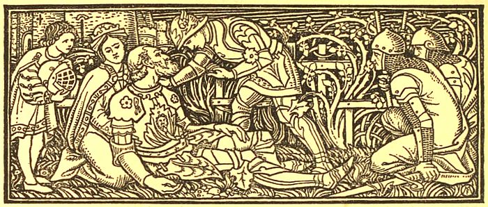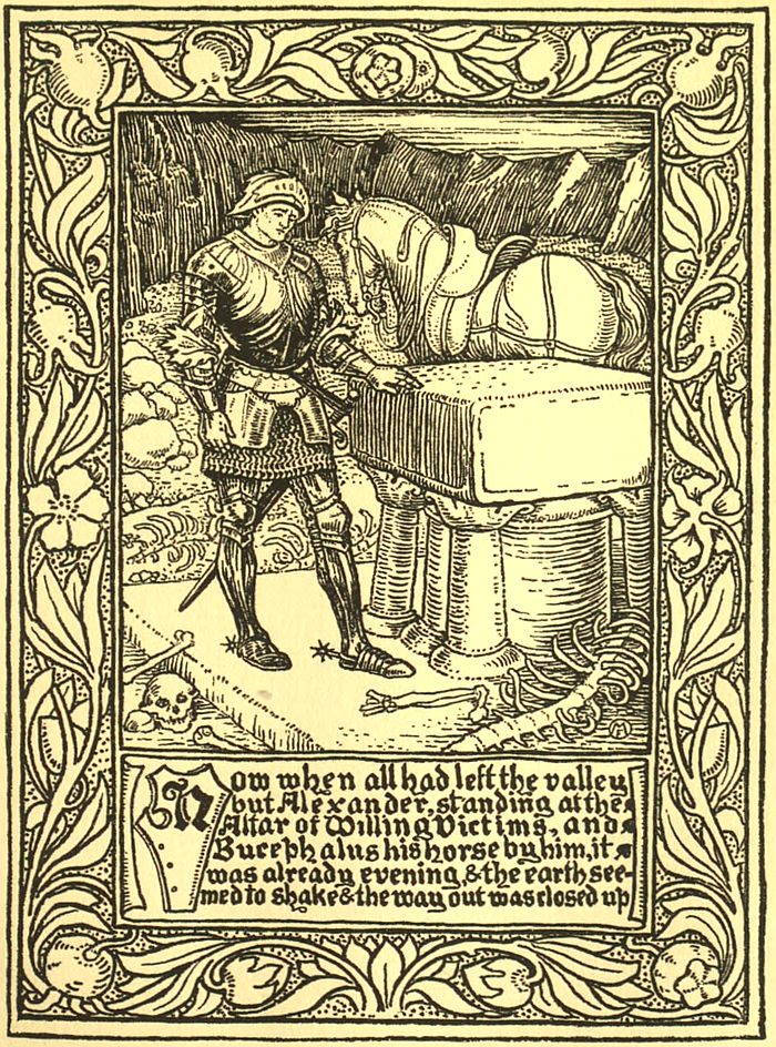 So the lord of the lists stood up and bade the heralds bring the knights before him, but they came back and told him how Porus lay deathlike on the field, yet was he unhurt to all seeming, so Ptolemy spake to Alexander and said, “Sir Alexander, thou hast done thy duly as a true knight, thine adversary is at thy mercy to slay or to spare.” Then Alexander answered, “Were it not for his traitorous dealing to my good steed I would forgive him yet again, nor may I slay him unarmed, but by to-morrow morn I will meet him again on foot, sword to sword, till one of us die.” Then the squires carried Porus away to his tent, and the Indian knights went away from the field shamefast,[178] but the Persians and the Greeks rejoiced in the fame of their lord, and mourned over the death of the good steed Bucephalus. That day Alexander built a tomb for his horse and laid him there, and bitter were the tears he shed, for it seemed to him that the best days of his life were beginning to leave him, and his evil days had begun.
