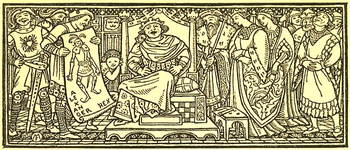 Now the king was sitting on his throne under the daïs at the upper end of the hall, and on his right hand sat the noble Alexander, and round the king on his right and his left were the nobles of the land, greybeards and youth. And when the coming of the heralds was told them the king rose from his seat, and as they stepped forward so did he, and he came to the middle of the hall and three steps further, for all men did reverence in those days to the herald. And he greeted them, and on the neck of each man he threw a chain of gold, and much he praised them for their fame. But the heralds spoke and said, “O king, we have a message for thee, nor may we delay.” And he said, “Speak on.”