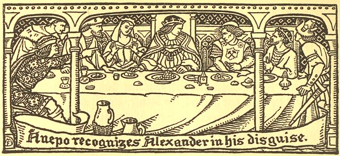 And one other day, as Philip sat in his great hall, with all his nobles and chief men round him, there came a singing-bird into the hall and sang a sweet song, and circled his head, and came and sat on his knee, and there dropped an egg and flew away. Then as the king sat and looked, the egg rolled from his knee and fell to the ground, and there it broke, and a little worm came out and crawled about, but soon it died. Then a great clerk near him said: “This signifieth, O king, that thy blithe lady’s son shall walk the world and win it, and die a bitter death before he may return.” These were the wonders that happened ere the birth of Alexander.