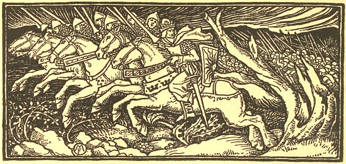 Now were men on both parts getting them ready for the fight. Alexander hurried home into Macedon and assembled a mighty host of knights and archers, men proved and skilled in arms. And when the host was assembled, with his princes and captains, he sought the presence of Philip and took his leave, and mounting Bucephalus his brave white horse, he led, first of all, his army out of the broad gates of the town. So on the appointed day the field is covered with the array of either host, and now men lift up the banners and shake them out to the wind, and the clarions sound out till the whole field rings with the music, and the woods and the hills answer[27] them again. Then each noble prepares for battle, his helm on his head he strides to his horse, and jumps on his steel-clad saddle, he hangs round his throat his bright shimmering shield, and handles his lance. Then is the stamping of steeds, the stripping of banners, the clouds of dust rise in the air, and suddenly the crowds meet with a shock in the middle of the plain. Now the steeds rear up against each other, and the spears break through the blazoned shields and through the helmet bars, while the cypress lance shafts splinter into fragments, and down fall knights and dukes from their steeds.