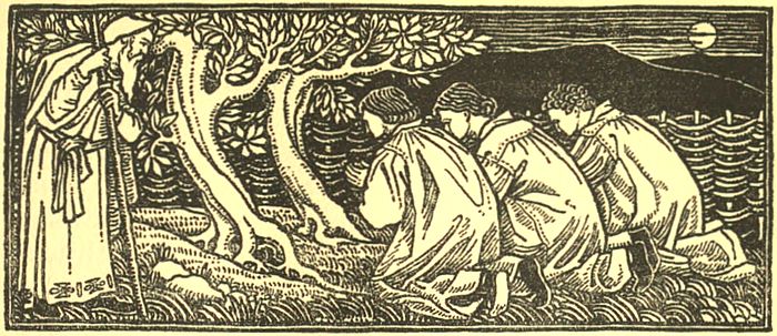 Now when they were come to the inner door of the hall, the negro bowed himself down before them, and opened the door before them, but went not in himself, for that room was the chief of the palace, and when they lifted up their heads they saw before them a couch and on it was a man. Now the hangings of the couch were of golden brocade, and its coverlet was blue, embroidered with shining ones in bright gold, and the bedhead was embroidered with cherubim with glancing wings, and the canopy with the bright seraphim.[163] The curtains were of silk and on them was a fair garden of needlework, and in it were beasts and birds, and the pillars were of the same, and all the points and ornaments were of pearl. The romance tells that he who rested in that room was one of the noblest-looking men that ever had life, with a face bright and bold as fire, his hair was long and grey, and his beard was as white as the driven snow. When the King and his peers saw him they knew that he must be of the blood of the gods and not of mankind, and they knelt down on the ground before him, and saluted him with all reverence. Then he reached out his arms to them, and raised him on the bed, and answered them: “Hail, Alexander,” said he, “All hail, thou who wieldest the earth, thou and thy princes are welcome. Sir, thou shalt see with thy sight such marvels as never before man saw; and thou shalt hear of what shall come, things that no man hath heard but thee.” Then was the King astonished that his name was known, and he said, “Oh, holy happy man, how dost thou name my name, since thou hast never seen me before?” And the god answered: “Yea, I knew thee ere a word of thy fame had spread over the earth.” Then he went on: “Wish ye to look upon the trees that bloom for ever, the trees of the sun and of the moon, that can speak and tell thee of what is to be?” And Alexander the king said, “Yes by my crown, this would I do more[164] than anything else in the world.” Then the god said, “Art thou clean of body and mind, thou and thy friends; for no man may enter the place where they are who is not pure of all stain?” and Alexander answered that they were. So the Elder arose from his bed, and cast on him a mantle of gold, and the ground glittered for the glory of his weeds, and he led them to the door, and there stood there two elders like to those Alexander had seen at the Parting of the Ways, and he gave them into their hands, and bade them lead them to the place where they would be. Then he turned and departed, and Alexander and his friends Ptolemy and Antiochus went with the elders.