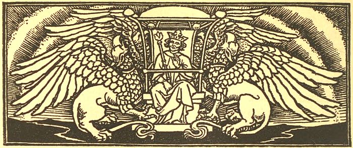 And Alexander the king spoke with their wise men of the combat with the dwarfs from the desert of the north, since the men of that land were exceeding wise, and they told him of the way by which he could fall on them at unawares; and when they knew that he had with him in the host the griffins they rejoiced and told him of a marvellous thing. Then the Lord of Macedon caused his smiths to make him a chair of black iron, and on the top of it at each corner was a large smaragd stone, and they brought the chair to the top of an exceeding high mountain in that land, and when they had come thither they bound the griffins to each corner[196] of the chair at the bottom with great and very strong chains, for Alexander was minded to be carried up into the air by the griffins that he might see all lands. So when he was set in his chair and covered round with great bars of iron, he bade them uncover the eyes of the griffins, and they saw the smaragd stones fixed high above them and all at once they flew up towards the stones, for the sight of that stone is meat and drink to these animals, and they hunger to gather it together and to bear it off to their dens, neither care they for any hurt they receive in the getting of it. So they flew and soon Alexander was borne out of sight of men, high above the clouds, and he saw the earth below him like a basin, and the lands, and the way to the dwarfs, the men of Gog and Magog, and still they flew higher and the earth grew small like a mill-stone and the ocean and the rivers seemed like a writhing adder, and then the gods struck the griffins with fear, and they shut their eyes and stretched out their wings, and sunk lower and lower till they lay at the last on the ground in a green field in a strange land, and Alexander looked round and saw far on the towers of Jerusalem. But the griffins arose, and flew away till they came to their nest in the mountains, and when they came thither the Lord of Macedon left his seat and made his way through the hills till he came to the river, when he crossed it and came to his army again.