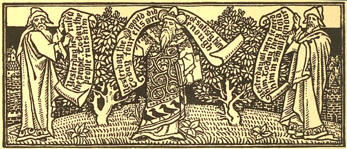 There stood up in the midst of them a lord of Macedon, Solentius by name, and said “Men of Macedon, our land was a small one, and our name was lightly esteemed in Greece, till this man’s father[214] was born, and he ruled us and made us a mighty people among the Greeks, and subdued Athens and made us first among the folk of our land. And when he died, and Alexander our lord came to the throne he went wide into the world, and rode over it, and conquered it, and he made the footmen of his army lords over the people and kings among the barbarian folk, so that no man stands before the Macedonians, and they are the first of folk under heaven. Now is he at point to die, and what shall fall to us, for no man has he left behind him who can take his place. Soon shall the empire of the Macedonians be broken to pieces, and the name of the country be forgotten.” And all men said that he had spoken true, and they lamented exceedingly.