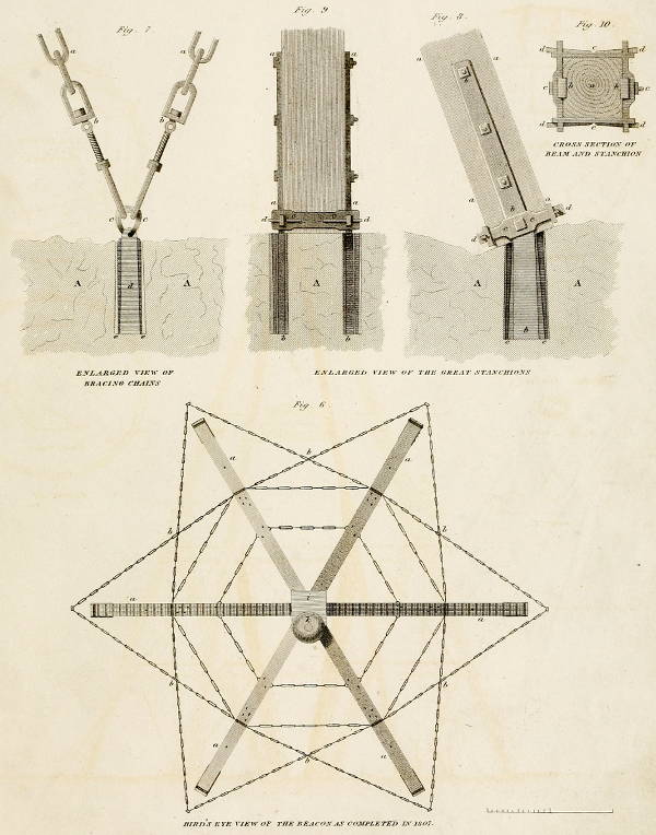 | [x]The Smeaton arrives at the Rock, 18th September, with the Beams of the Beacon-house. Preparations made, and four of the principal ones erected. Method of raising them, and fixing the great Iron-Stanchions. Seven hours’ work upon the Rock in one ebb-tide. The remaining two principal, and four of the supporting beams, erected. | 166–171 |