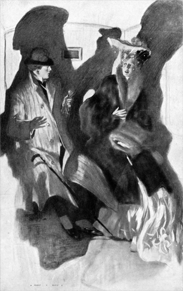 At the sound of the match striking, the young lady turned her head. Then, as the bright flame illuminated the young man’s face, she sat bolt upright, dropping the muff to her lap with a cry of dismay.