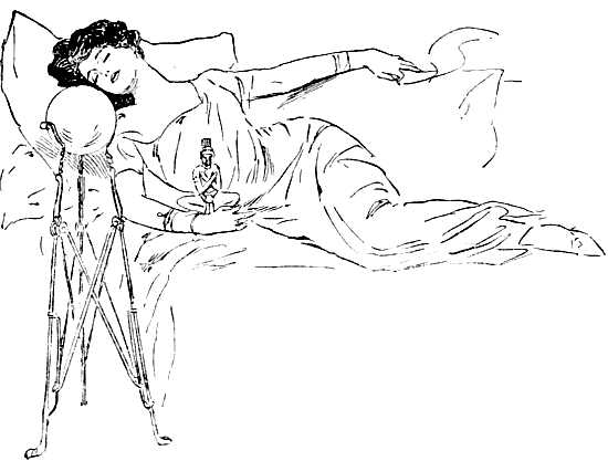 Somebody brought the tripod with its crystal sphere and set it down in the middle of the room. Its mild rays fell on the marble basin of the tiny fountain,—Duane's offering. The goldfish which I had given her were floating there fast asleep.