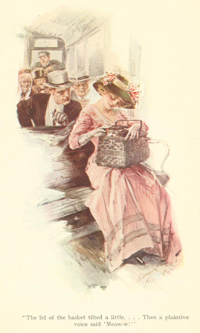 "The lid of the basket tilted a little.... Then a plaintive voice said 'Meow-w!'"